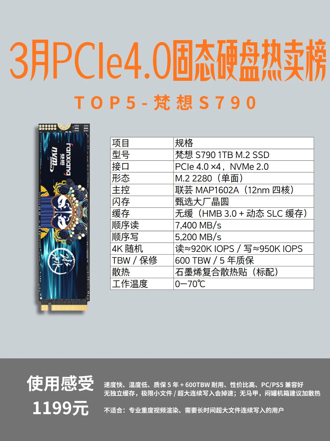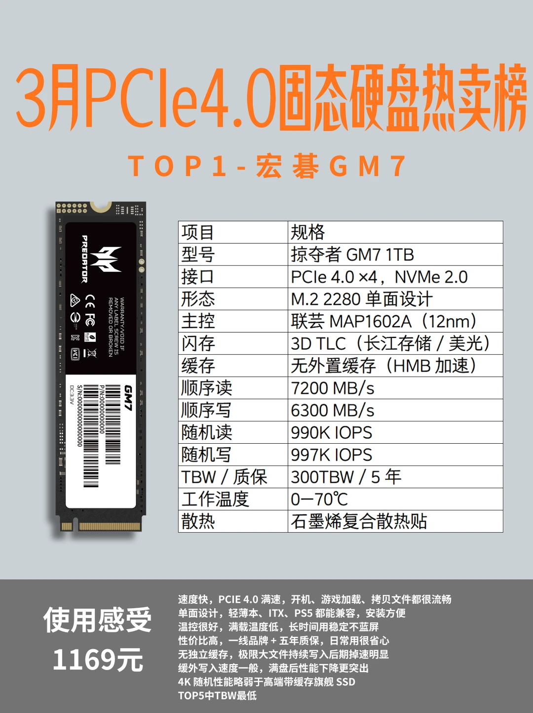 理由:600GB SLC 缓存,视频 / 素材 / 游戏安装更稳;1TB 仅 1199 元,比宏碁贵 30 元。
