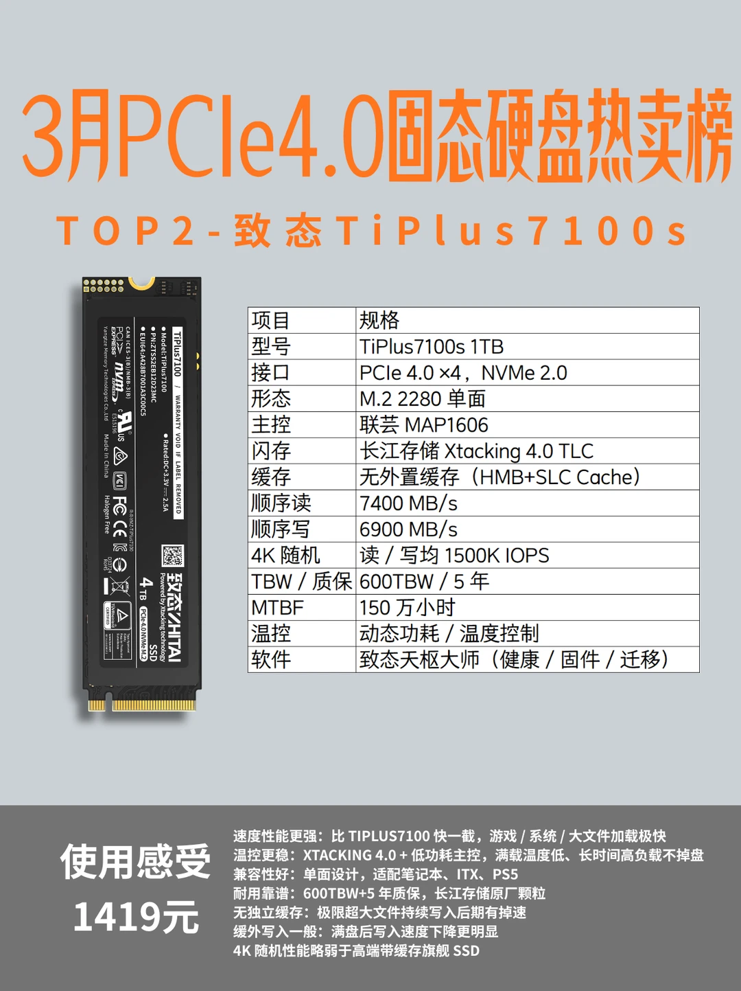 理由:长存原厂 + Xtacking 4.0+7400MB/s,稳定性拉满,适合支持国产的用户。