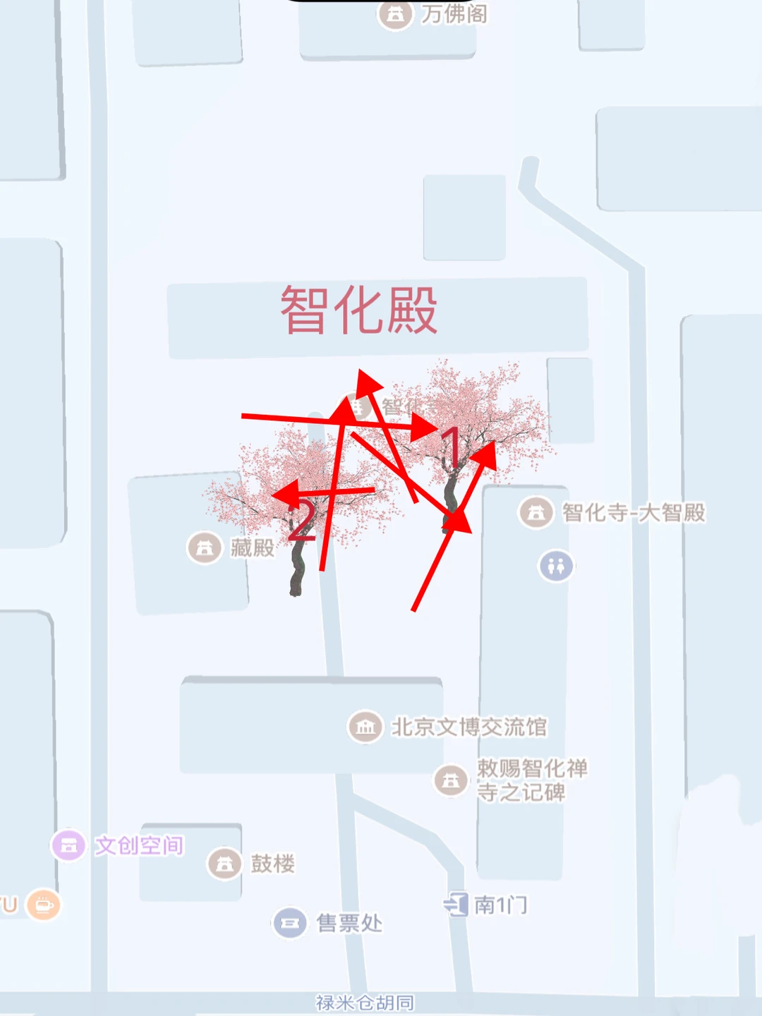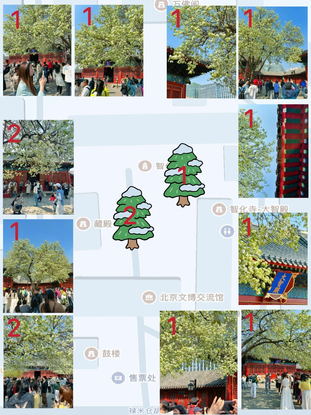 智化殿门口的树🌲为1,藏殿门口的树🌲为2。
