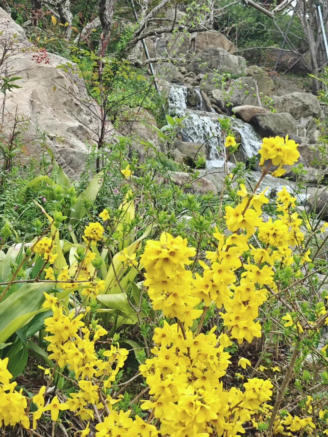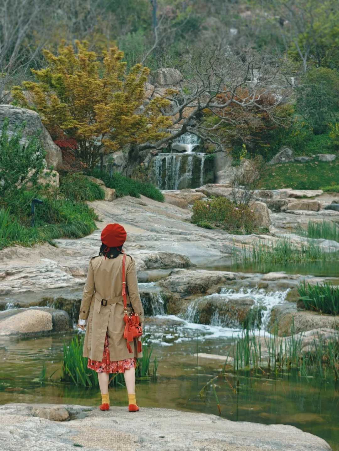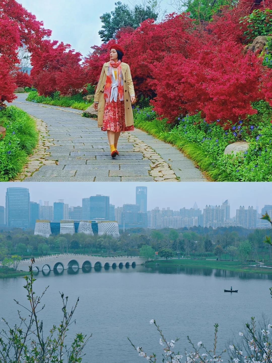 登山入口处的两旁种满了红花檵木,玫红一片在绿色掩映下分外娇艳。双子山上也有不少樱花,俯瞰园区全景,可将樱花作为前景拍摄十一孔桥,连翘作为前景拍小瀑布,也可以拍与水景的合影(记得穿防滑的🥿)。记得在登顶后的打个卡,咱也是征服过4800cm高峰的人了呢!