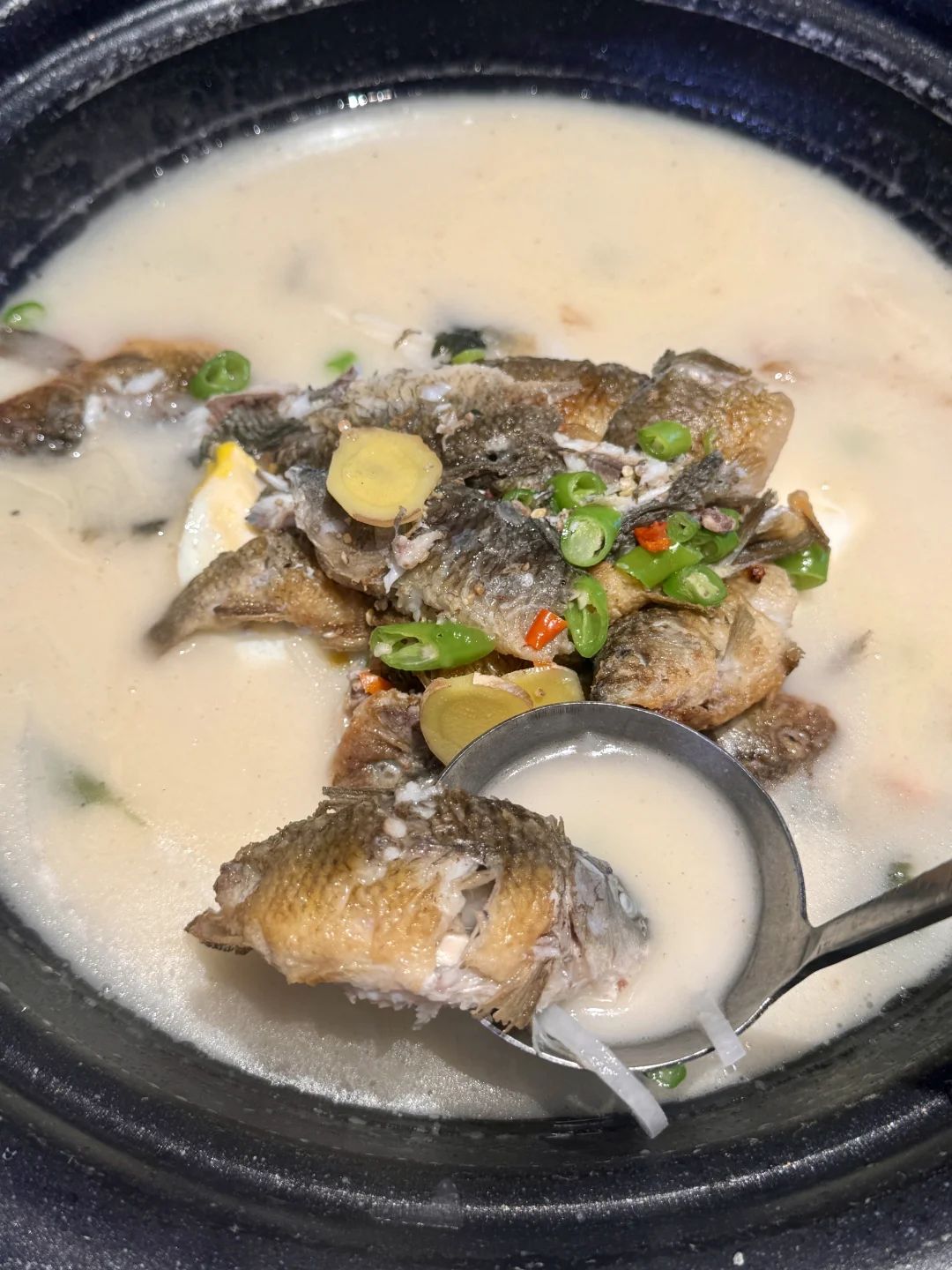 金黄焦香的荷包蛋浸在乳白色的鱼汤里,汤那叫一个鲜掉眉毛,是那种带着锅气、热腾腾的鲜。鱼肉又滑又嫩,筷子一夹就脱骨