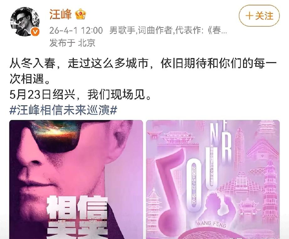 汪峰高调官宣!5月23日绍兴开唱,摇滚热血不减 4月1日中午,汪峰突然发文官宣巡演绍兴站,定档5月23日,海报氛围感拉满,尽显摇滚范儿。 从冬天唱到春天,他一路奔赴多城,依旧满怀期待与歌迷相见。两张巡演海报设计用心,一张酷感十足,一张融入绍兴地标,细节满满。 作为华语乐坛常青树,《春天里》《怒放的生命》承载无数青春回忆。多年坚守舞台,汪峰的摇滚热忱从未褪色,用歌声与歌迷双向奔赴。期待这场音乐盛宴! 汪峰追妻攻略 汪峰晋城演唱会