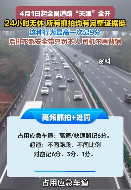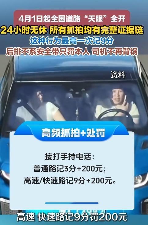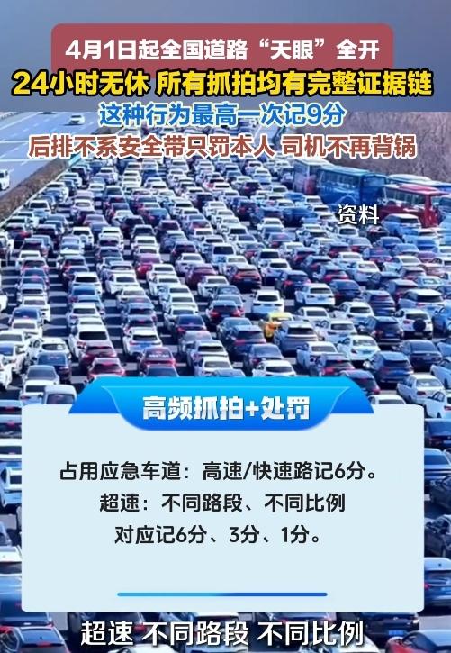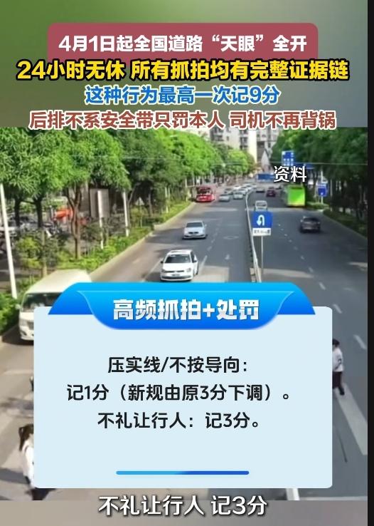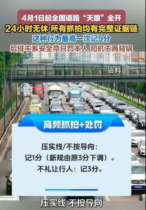 “注意啦!4月1日起,全国交通新规上线,320多万套‘天眼’升级完,24小时盯着咱开车呢!” 这事儿可不是说着玩的,从4月1日开始,全国范围内的智能摄像头都完成了升级,全域覆盖没死角,AI自动抓拍根本不停歇。不管是开车时接打手持电话,还是压实线、不按导向行驶,哪怕是不礼让行人,都逃不过它的“眼睛”。 具体咋罚?咱得拎清楚:普通路上违规记3分罚200元,高速或快速路上就更严,记9分罚200元;压实线、不按导向走记1分;不礼让行人记3分;占用应急车道,高速或快速路上直接记6分;超速的话,不同路段、不同比例,对应记6分、3分或1分。 最关键的变化是啥?取消“全车连坐”了!以前后排乘客没系安全带,司机可能跟着受罚,现在改了——后排没系,只罚乘客本人;但要是司机没提醒,那司机就得单独受罚。而且这次“天眼”升级后,异地违法也能同步记录、同步处罚,交管12123会实时推送信息,所有抓拍都有完整证据链,想赖都赖不掉。 说真的,这些新规看着严,其实都是为了大家的安全。开车系安全带、不玩手机、礼让行人,这些本就是该守的规矩,新规不过是把“提醒”变成了更有力的“约束”。养成好习惯,不仅能少挨罚,更能保平安,你说对不? 你觉得这次新规能让大家更重视交通规则吗?身边有朋友已经开始注意这些细节了吗?评论区聊聊,也别忘了转发给身边的司机朋友提个醒~ 4月1日起严查安全带 交通新规实施 开车必知安全细则 信息来源:山东电视新闻频道 图片来源网络,如有侵权请联系删除