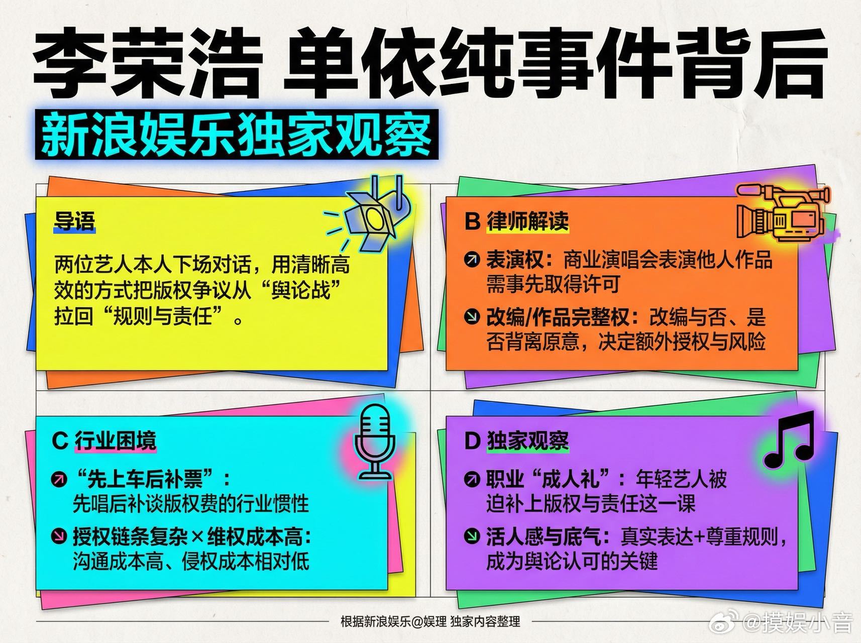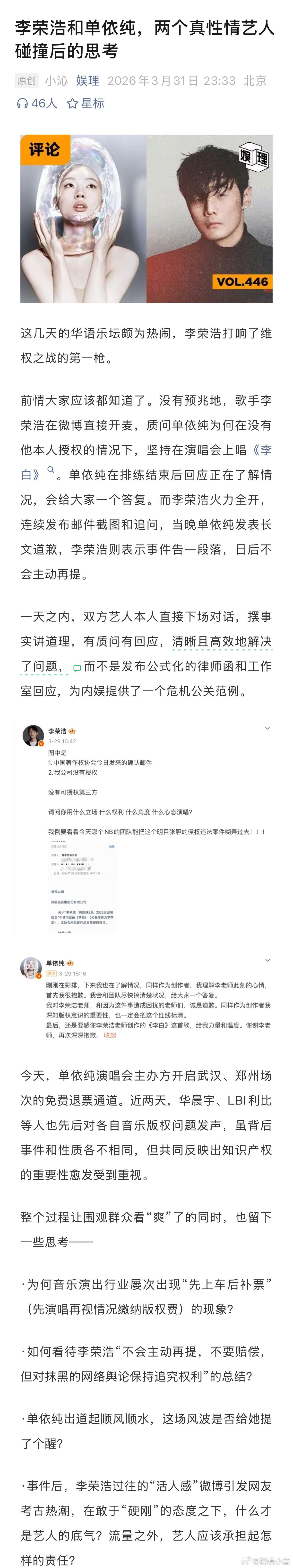 律师称音乐维权成本高于侵权成本音乐版权先上车后补票现象 在李荣浩、单依纯《李白》翻唱事件中,再次出现了“先上车后补票(先唱,之后再补谈版权费用)”现象。未取得授权却直接列入演唱曲目,或许存在冒险和侥幸心理,也或许是因为音乐圈长期以来的习惯性问题。尤其音综兴起后,版权方与节目组之间的授权关系更加复杂,出现很多模糊地带…娱理独家↓