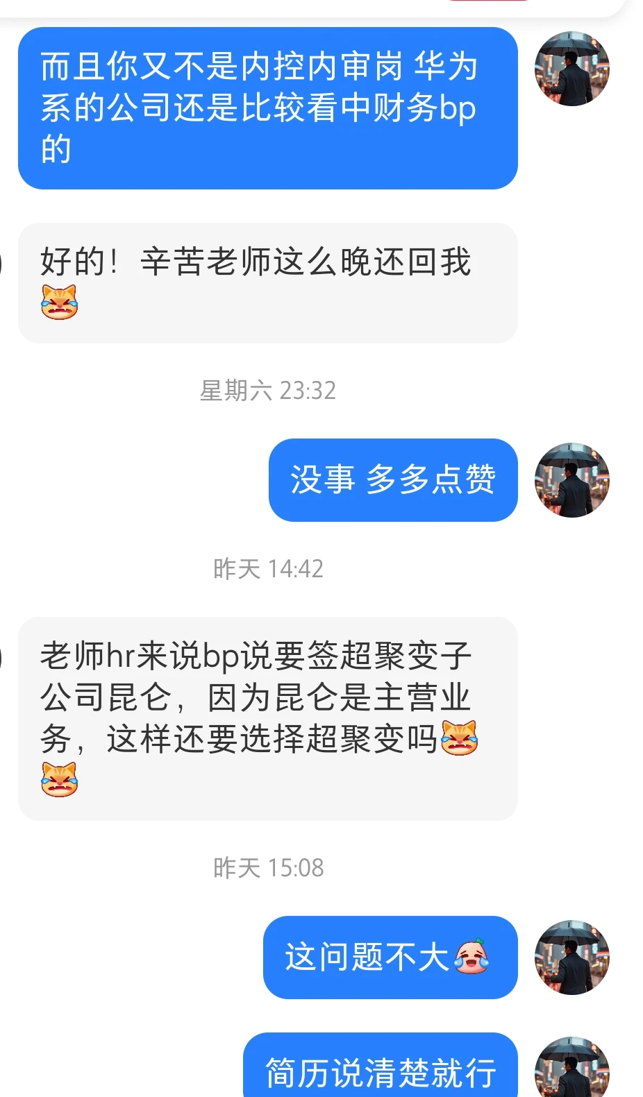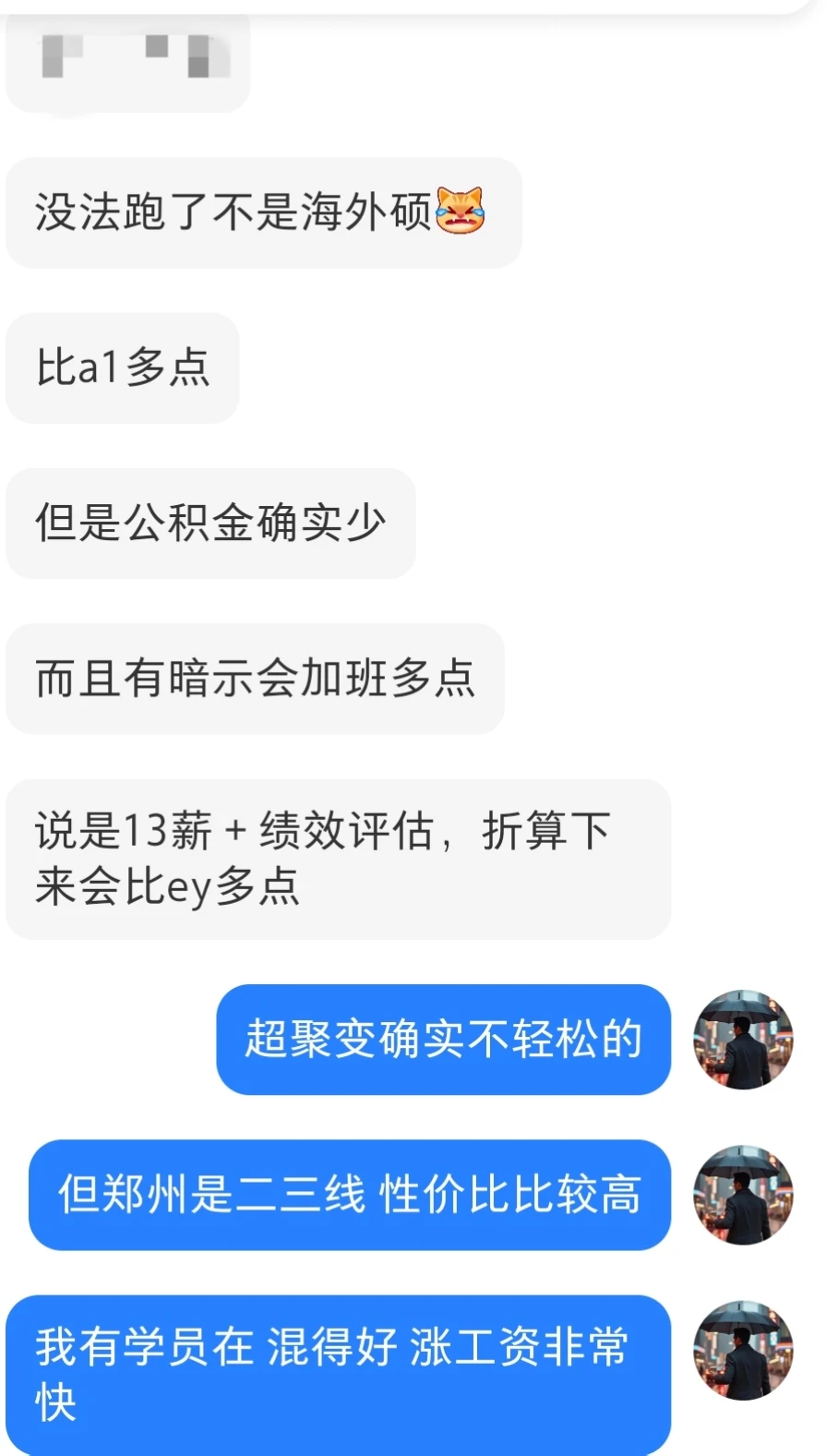 1.薪资绝对值差不多,但在二线,消费力更高 2.去四大拼命那股劲用来超聚变这边,获得额外收益可能性更高 3.还是财务bp岗,发展好 4.超聚变工作强度不低 现在四大要求三方真的越来越早了,麻烦[笑哭R]