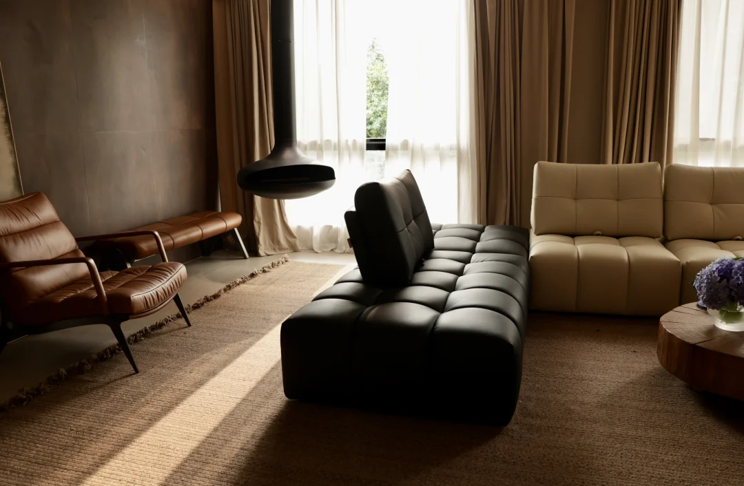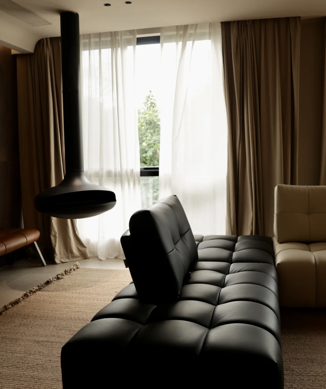 暖光从黑胡桃木柜的层板间漏下来,落在沙发的褶皱里,明暗交错间,皮革的呼吸感都清晰可见。原木墩茶几上的绣球花,和悬挂壁炉的跳动火光,又为这份厚重添了几分轻盈。