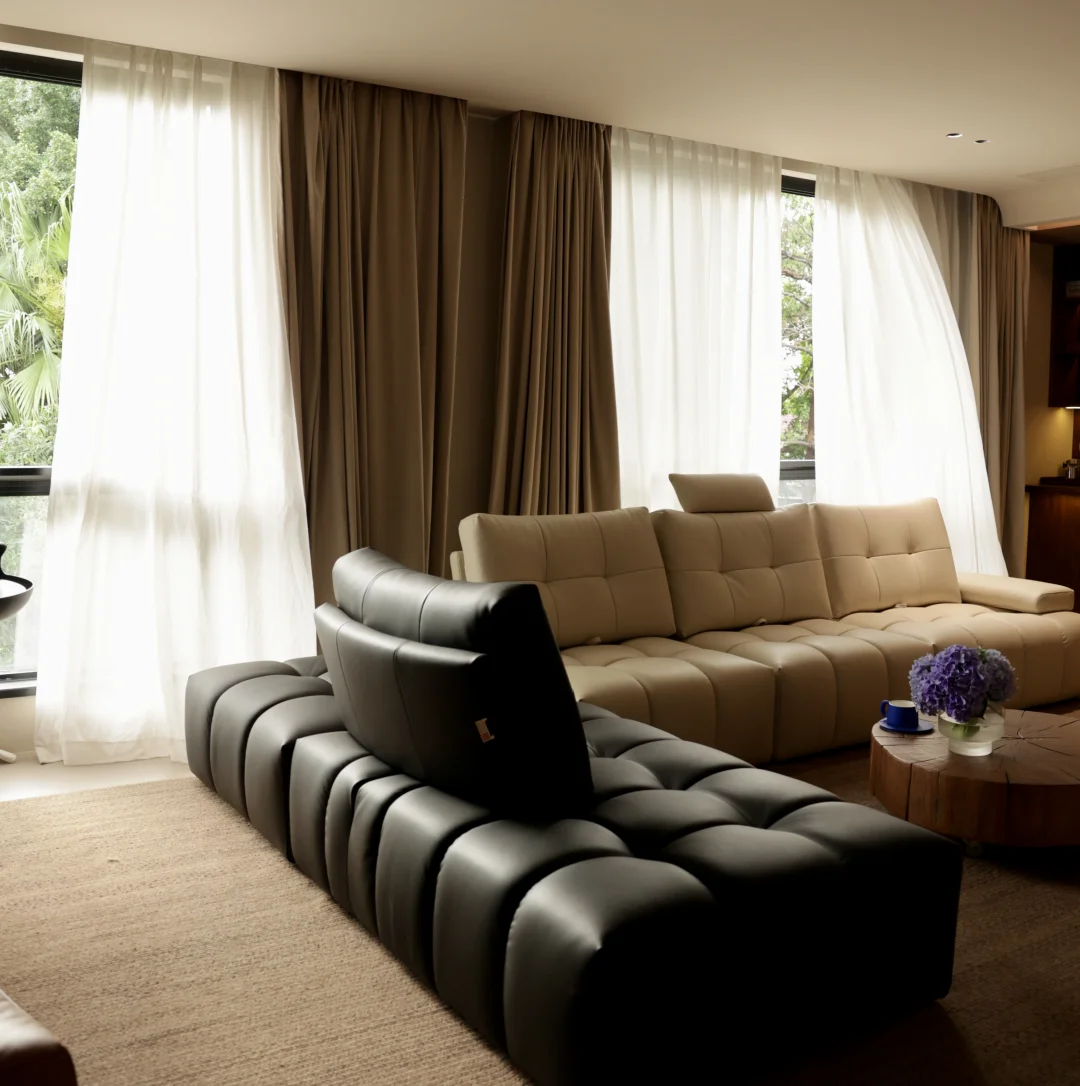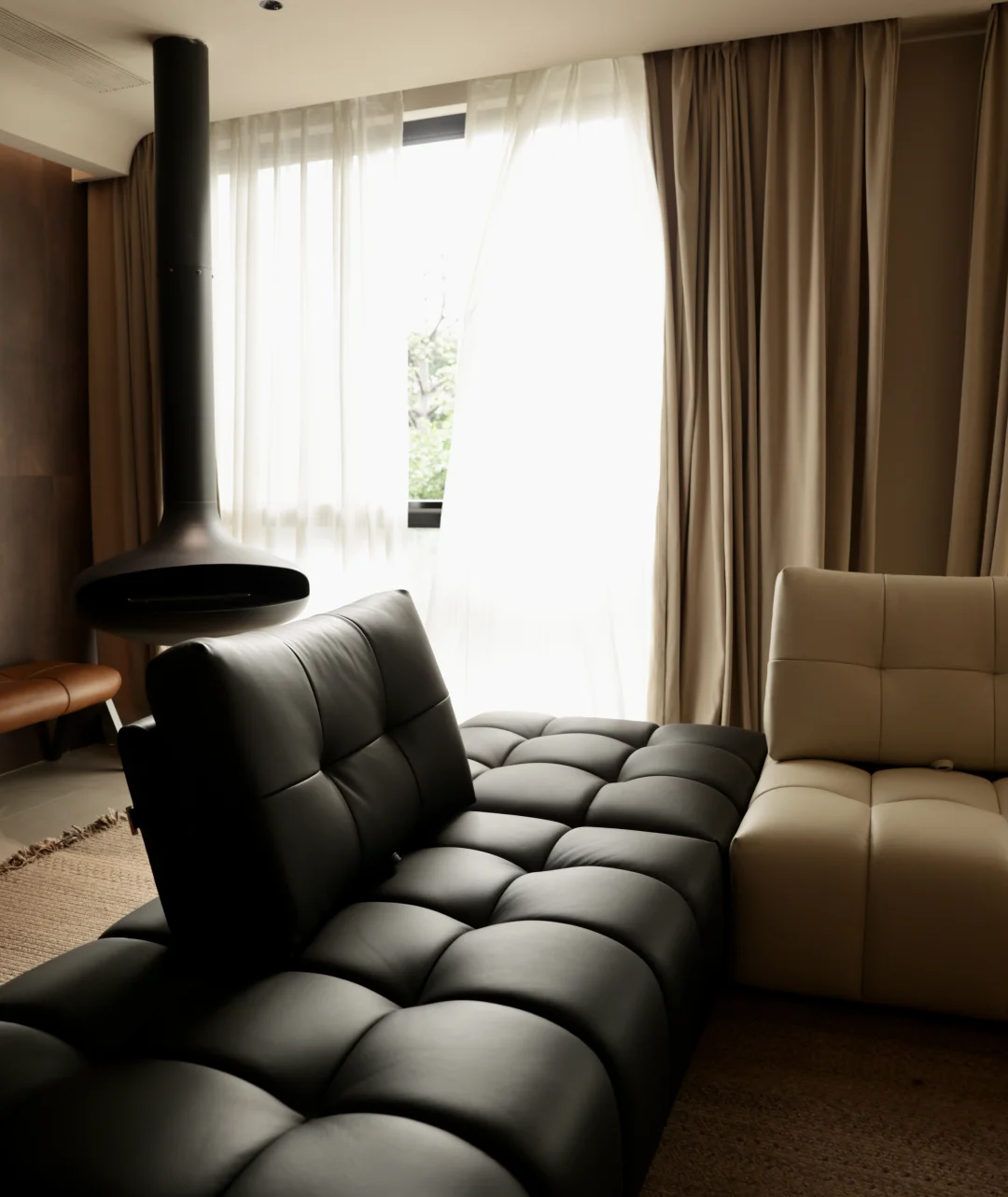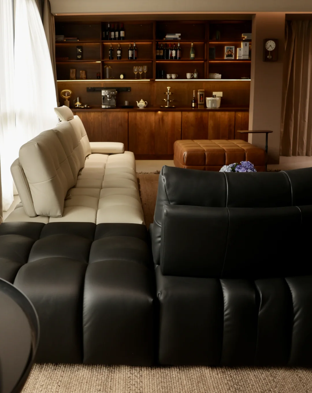这里没有复杂的装饰,两组真皮沙发就是空间的灵魂。黑色款是我的心头好,哑光荔枝纹真皮摸起来细腻又有分量,每一块方格都填充得敦实饱满,坐下去会被稳稳托住,却不会软塌塌地陷进去。微微倾斜的靠背刚好贴合肩颈,窝在里面看一部老电影,连疲惫都能被慢慢揉开。