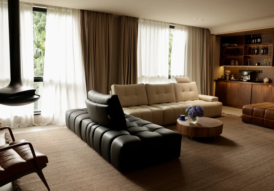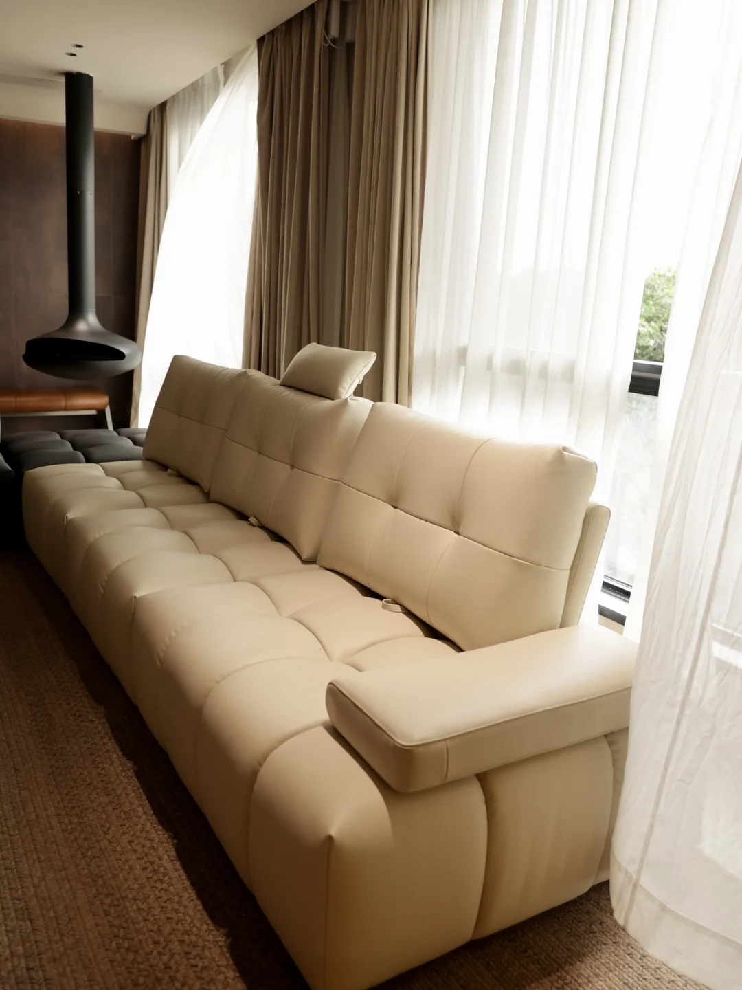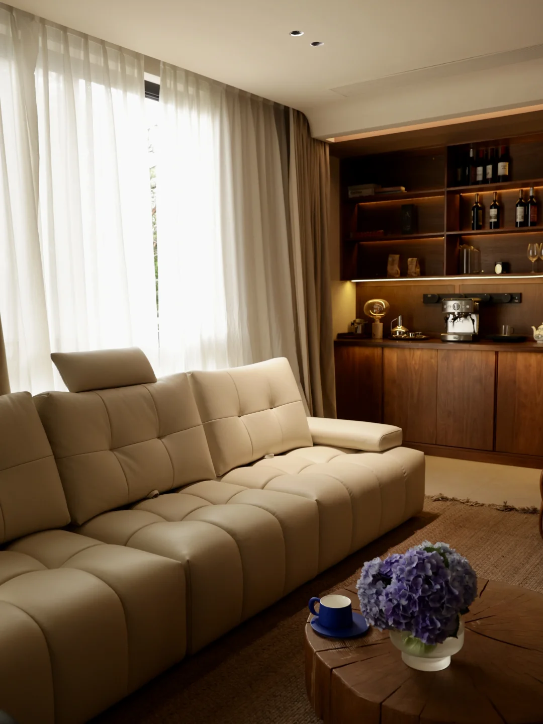 旁边的米白色色模块沙发更像一个可自由拼接的“家庭岛屿”,宽大的扶手能当临时枕头,平直的座面可以容纳一家四口并排而坐。孩子们会光着脚在上面蹦跳,先生靠在角落听黑胶,我捧着热咖啡窝在中间,连空气都变得柔软又慵懒。