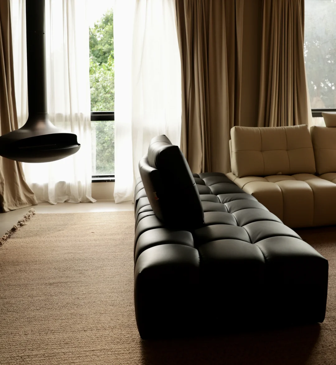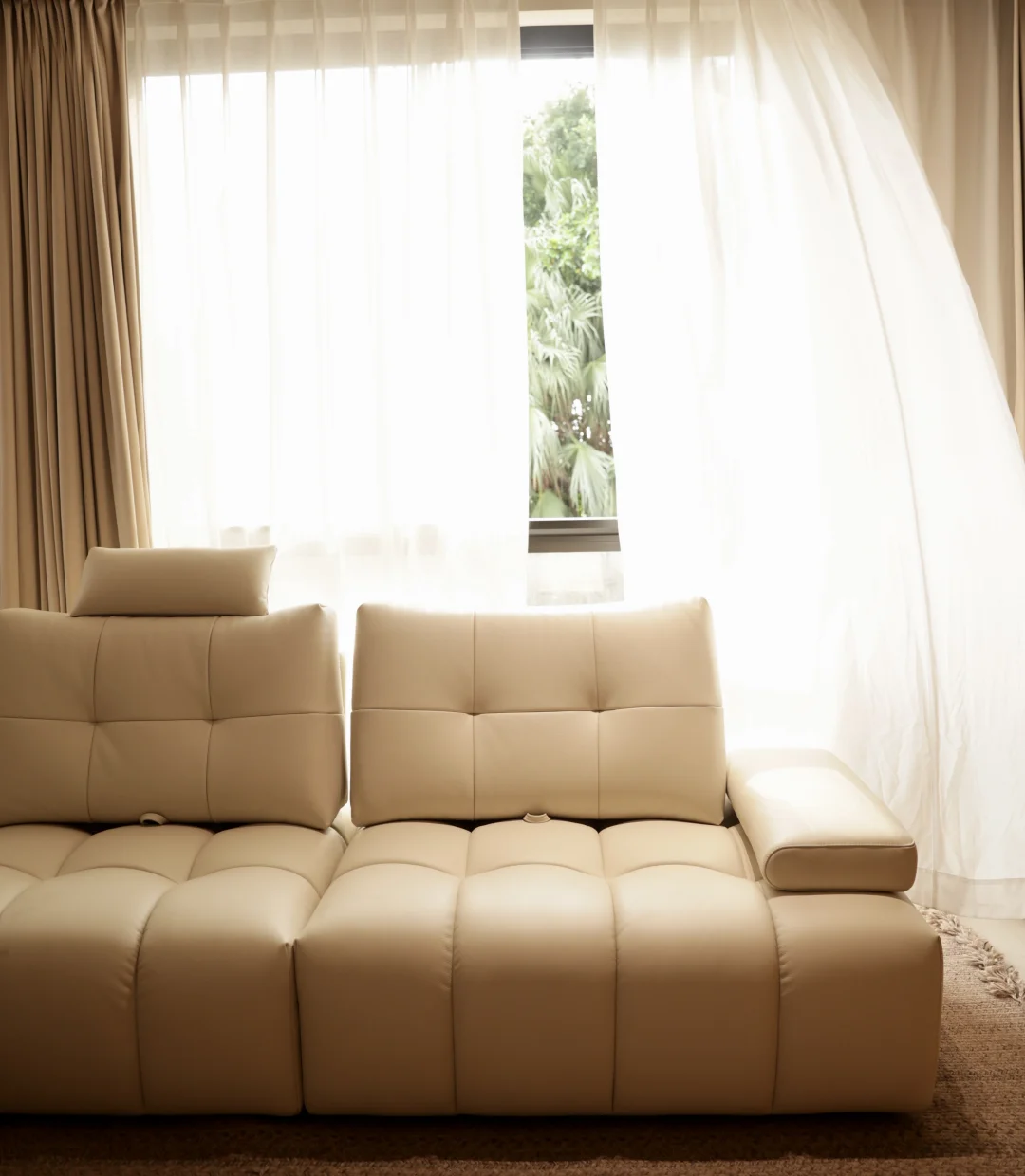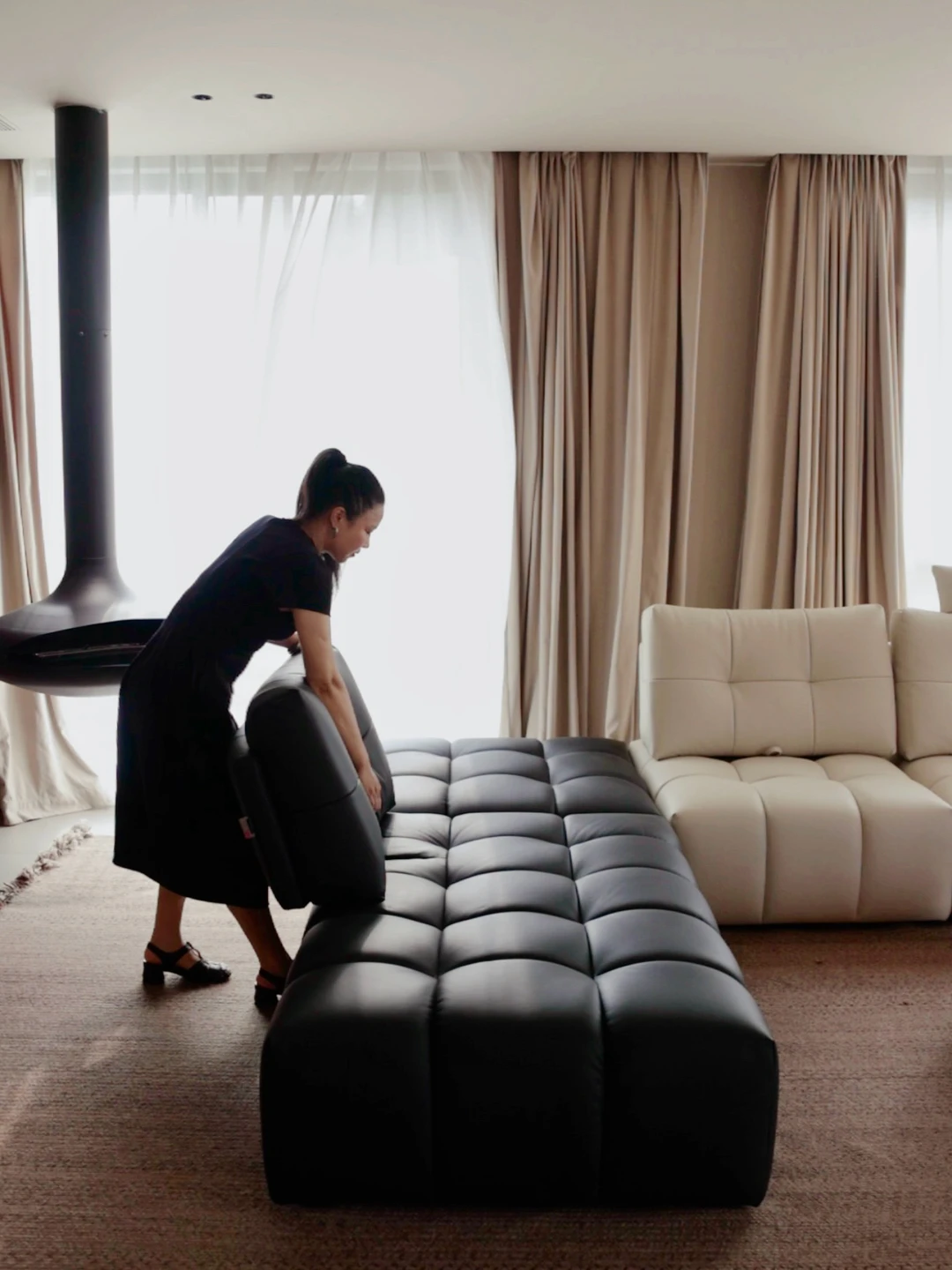 旁边的米白色色模块沙发更像一个可自由拼接的“家庭岛屿”,宽大的扶手能当临时枕头,平直的座面可以容纳一家四口并排而坐。孩子们会光着脚在上面蹦跳,先生靠在角落听黑胶,我捧着热咖啡窝在中间,连空气都变得柔软又慵懒。