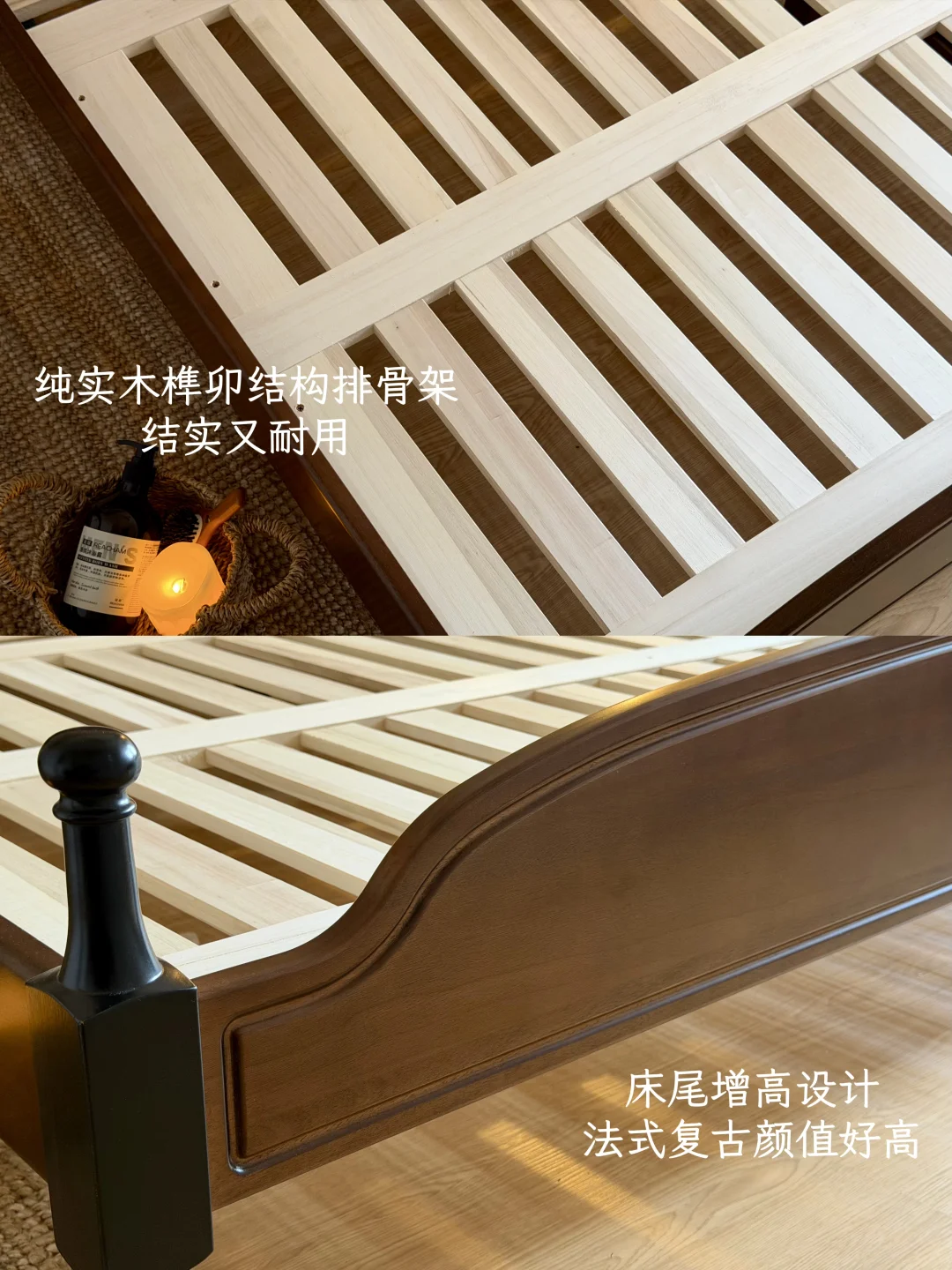 黑胡桃色+复古黑,比纯原木色沉稳,比纯中古风耐看,还不挑软装。我换过两套床品,一套奶油色、一套深灰色,都能搭。以后想换卧室风格,也不用换床,这点对我来说很重要——毕竟不想三年后觉得土。