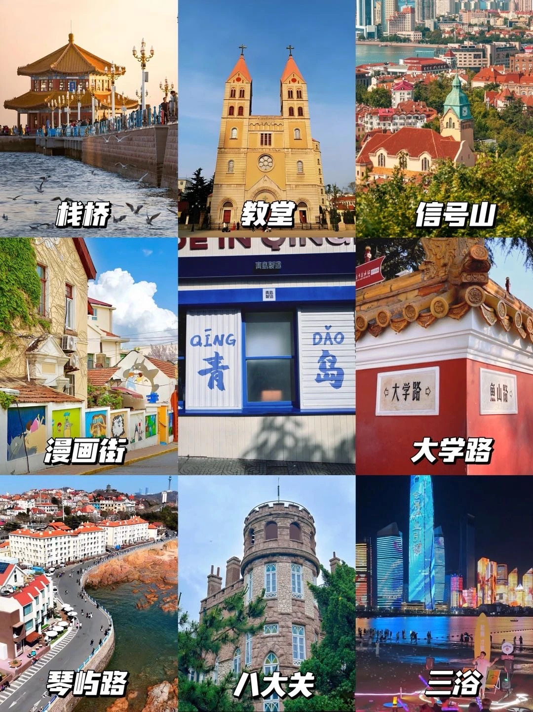 Day1:栈桥➡️圣弥厄尔教堂➡️信号山➡️大学路网红墙➡️宮崎骏漫画墙➡️小鱼山➡️鲁迅公园➡️琴屿路➡️小青岛➡️八大关➡️第三海水浴场➡️台东夜市