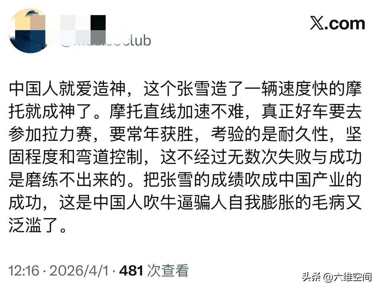 外网针对张雪机车的通稿话术已经开始出现了,就知道它们肯定不会这么轻易放过张雪机车的,机车是西方为数不多,仍然拥有超额利润的产业,特别是张雪说要5年内吃掉国际品牌50%的市场份额,它们怎么会忍得了,所以它们肯定要抹黑一波,现在国内大家都还在兴奋中,所以它们还不敢下手,先在外网试水温,找一些在国外的公知先带头抹黑和唱衰,然后再一步一步带节奏到国内的社交平台! 其实它们越这样上窜下跳,越说明张雪机车这次突破得含金量有多高,因为含金量高,它们才会那么在乎,才会那么想阻止!