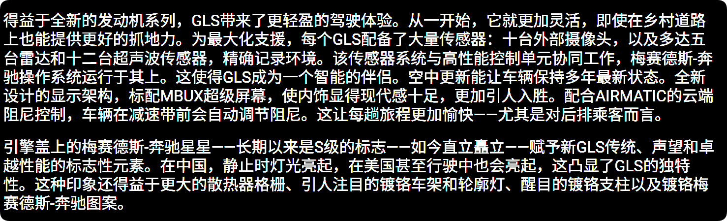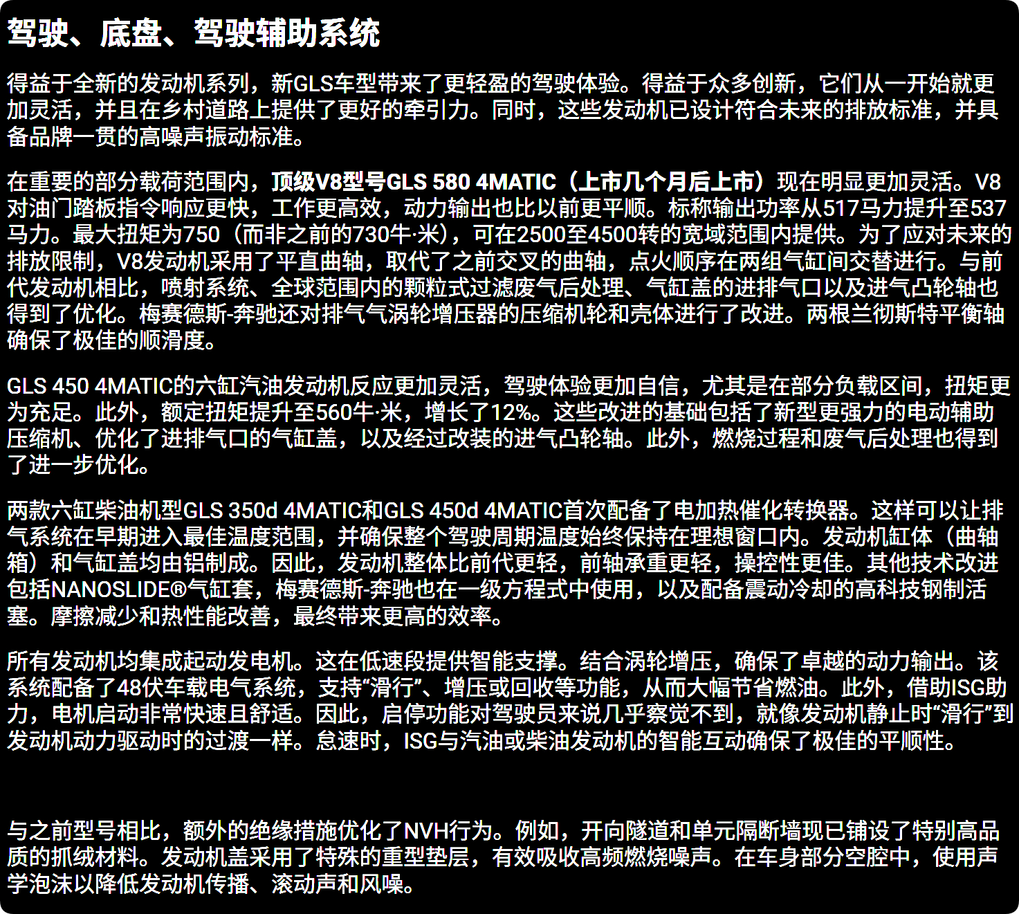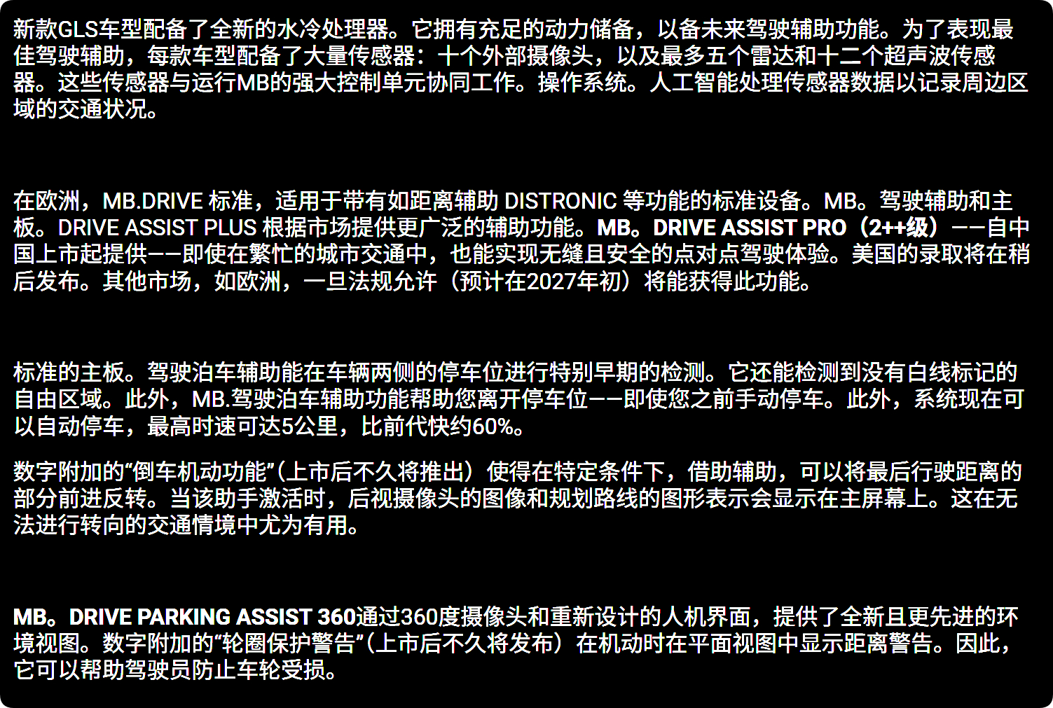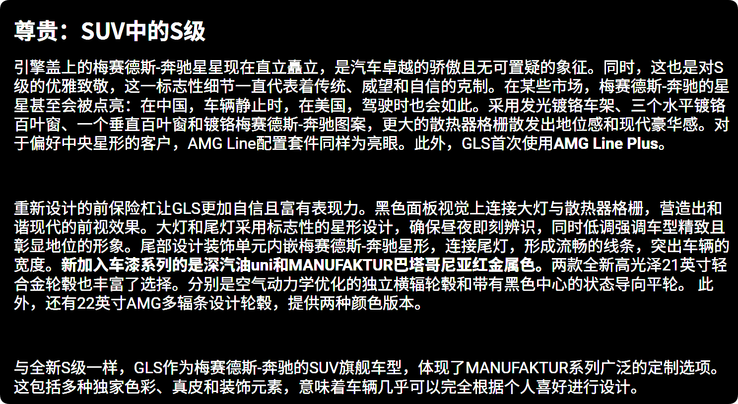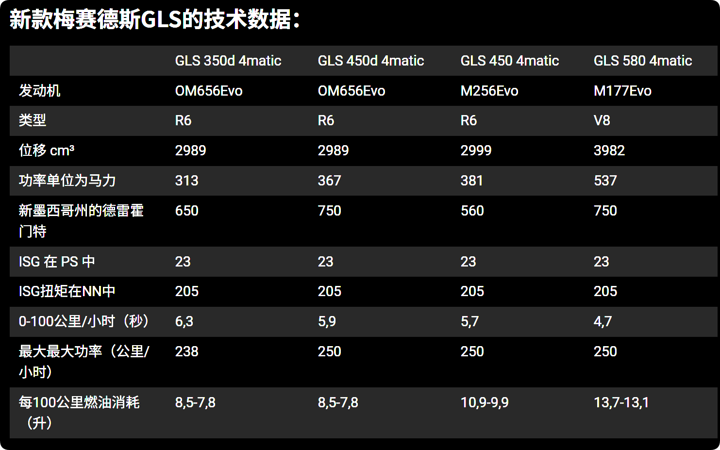 全新梅赛德斯-奔驰GLS详细信息SUV中的S级重新定义了舒适度动力更强,新发动机系列带来的卓越噪音舒适性依然多亏了最新的悬挂技术,几乎在所有驾驶情况下都有支持。驱动生成注重状态的更大散热器格栅,配有独特的镀铬车架和轮廓灯车头上的直立星星,可选发光(特定国家)支持AI的超级计算机,支持长期且最新的车辆软件现代显示概念,标配MBUX超级屏幕,包含乘客显示后排舒适套件Plus带来更强的行程和工作舒适度借助AIRMATIC的云端阻尼控制,乘坐舒适度明显提升搭载V8双涡轮增压发动机的GLS 63 AMG将要到2027年才会上市该订单将在未来几周内发布作为SUV中的S级,GLS体现了现代的豪华、舒适与数字智能愿景。他那无可置疑的“欢迎回家”。感觉在门关上的那一刻涌现,一种安全、平和与关怀的空间可以体验到。