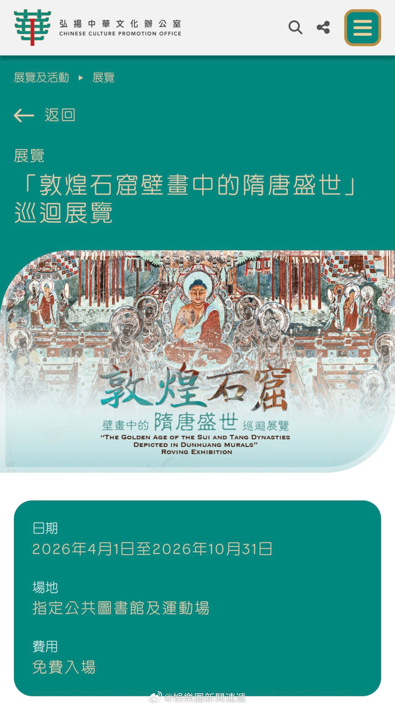 国际大都会香港 「敦煌石窟壁畫中的隋唐盛世 巡迴展覽今日起舉行..」香港特區政府康樂及文化事務署(康文署)轄下的弘揚中華文化辦公室 (弘揚辦 )與敦煌研究院合辦「敦煌石窟壁畫中的隋唐盛世」巡迴展覽,今日(四月一日)起至十月三十一日在多間公共圖書館及運動場地舉行。展覽精選敦煌石窟壁畫珍品作為切入點,透過文字及圖片解說,重現隋唐豐富多彩的生活圖景,帶領觀眾穿越時空,一窺千年前的盛世風貌,沉浸於敦煌藝術與隋唐社會的開放與繁榮之中。展覽免費入場。