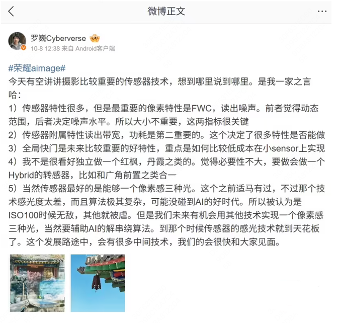 罗巍此前曾介绍,传感器特性中比较关键的是FWC和读出噪声,前者决定动态范围,后者决定噪声水平。此次超级原色Sensor的成功研发,标志着荣耀在手机影像传感器领域取得了阶段性技术突破。