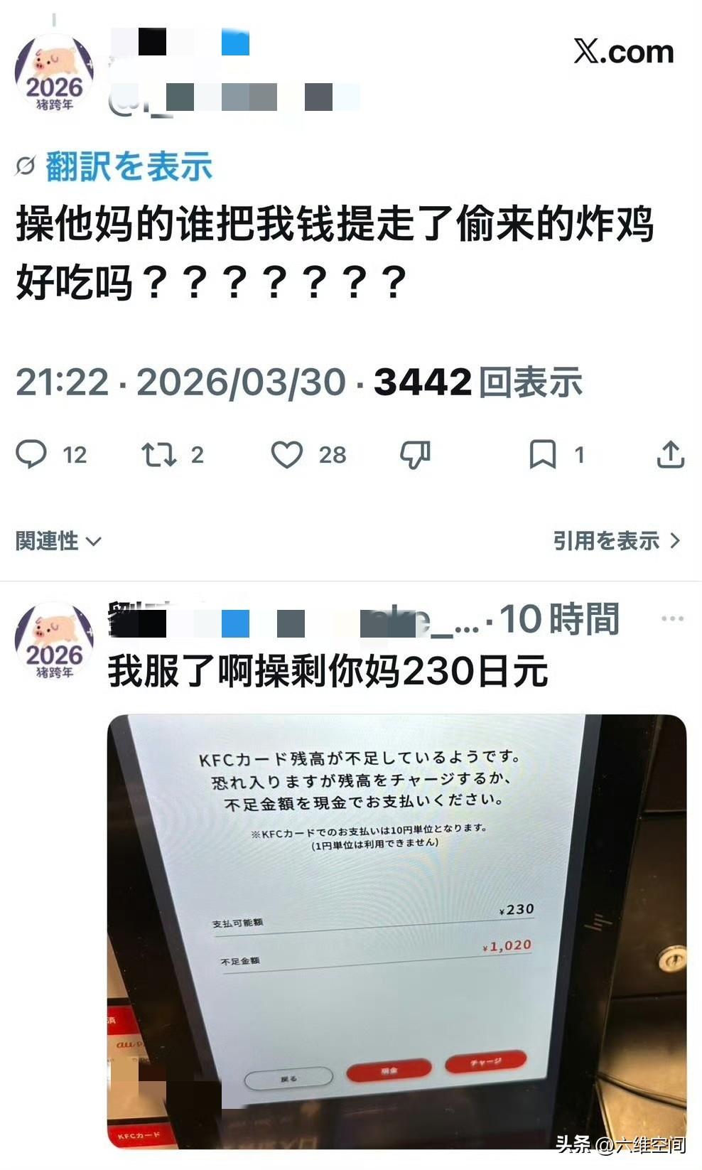 都这年头了,还有人吹捧日本人诚信,结果刚吹捧完日本社会城市,就被日本人打脸了! 有个人日本华人在日本点肯德基,因为配错餐了,就打电话去客服,然后就赔了一个储值卡,没有一点扯皮!这边刚吹捧完,去查储值卡的余额,发现2000日元只剩230日元,已经被人偷提取了1000多日元了,然后这个日本华人被气到爆粗口! 这应该就是现世报,大概率是它为了炫耀日本人赔给它的储值卡,拍照晒到网上,然后卡号之类被人看到了!