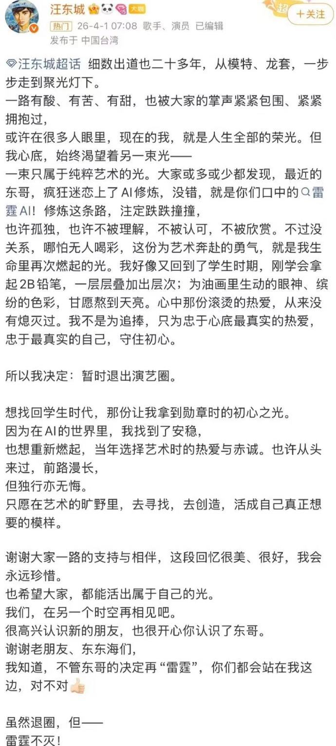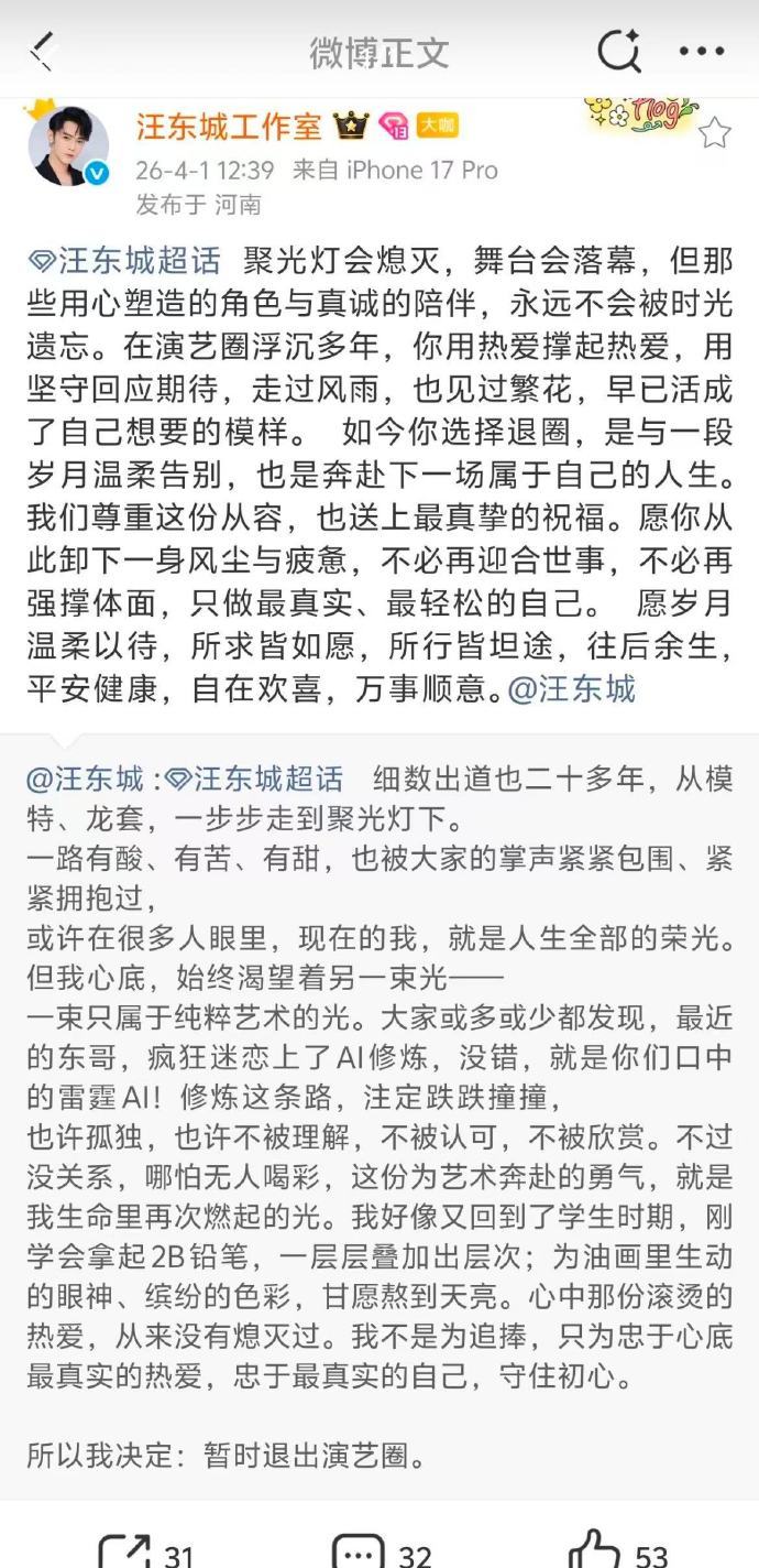汪东城每年愚人节都退圈 今天带着这个退圈的保留节目又毫不意外地上线了哈哈哈哈,工作室也都默契配合一起玩梗,能看出来哥是真的很爱过愚人节了,我差点就信了!
