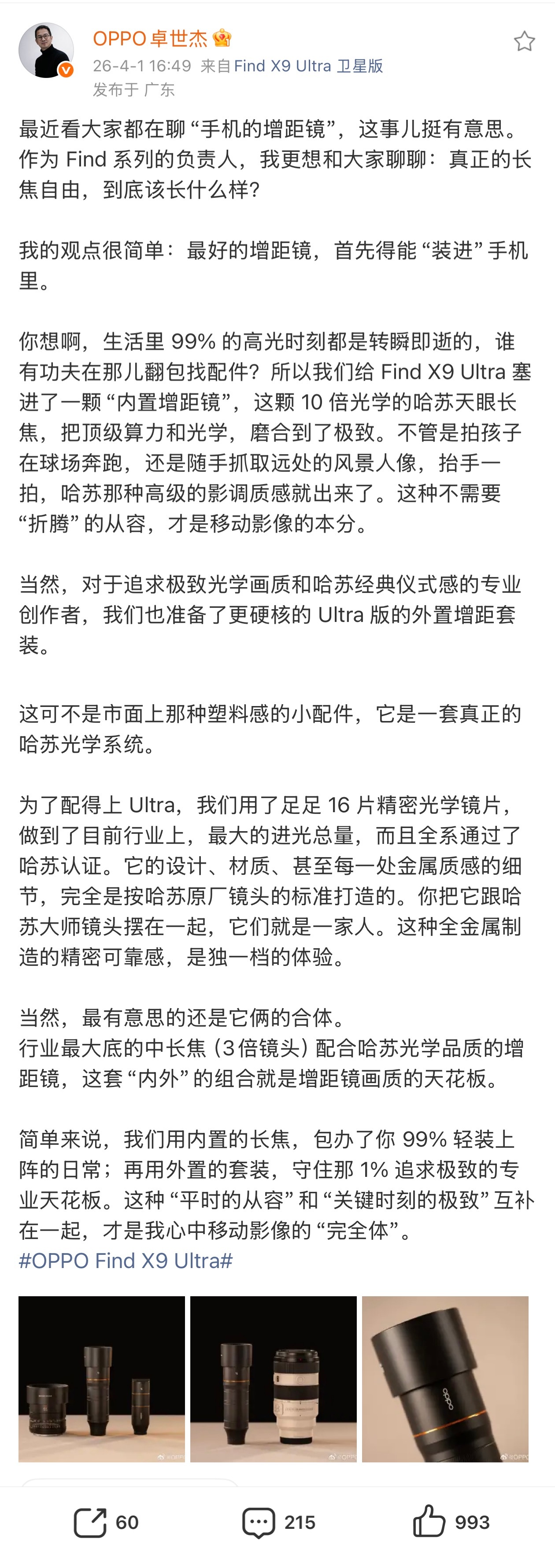 大家别忘了,Find X9 Ultra本身就支持 10 倍光学变焦,这次再加上这么大这么粗的增距镜,影像能力不敢想象,我太期待了!