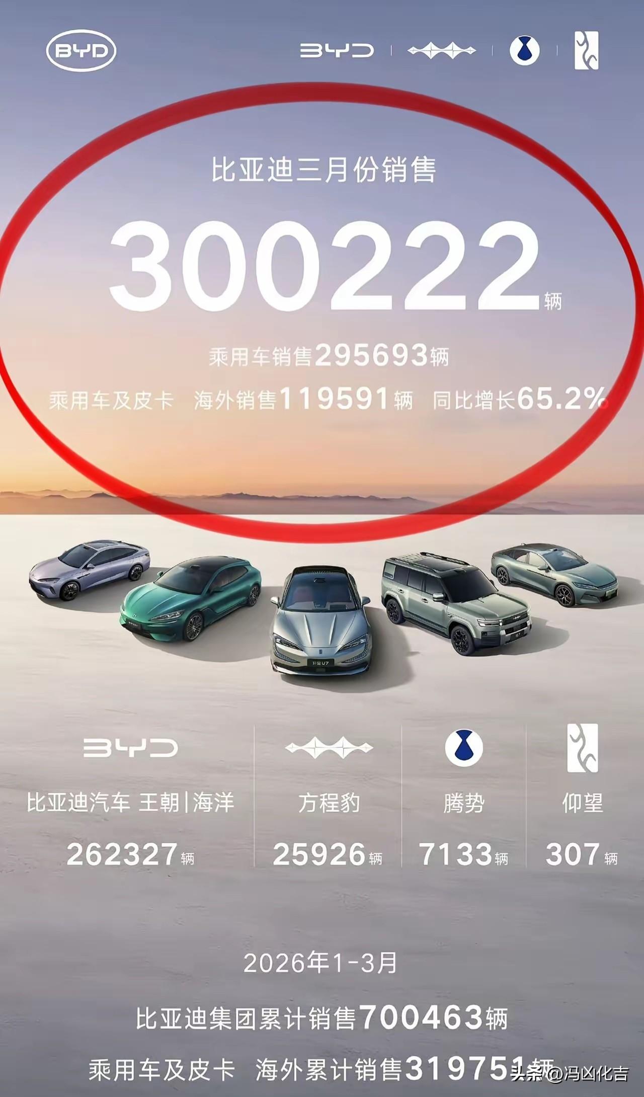 在如今汽车市场如此萎靡的情况下,在如此竞争的环境下,比亚迪三月份依然卖出了30万辆。国内市场销量持续下滑,国外销量少量增长。第一季度基本上与吉利持平。吉利的海外销量也增长很快。比亚迪摸着石头过河,他们跟着比亚迪过河,一些车企算是玩明白了。只能说比亚迪三月的销量颓废尽显。盲猜一下,2026年比亚迪销量必将超过500万辆,新能源汽车销量世界第一。