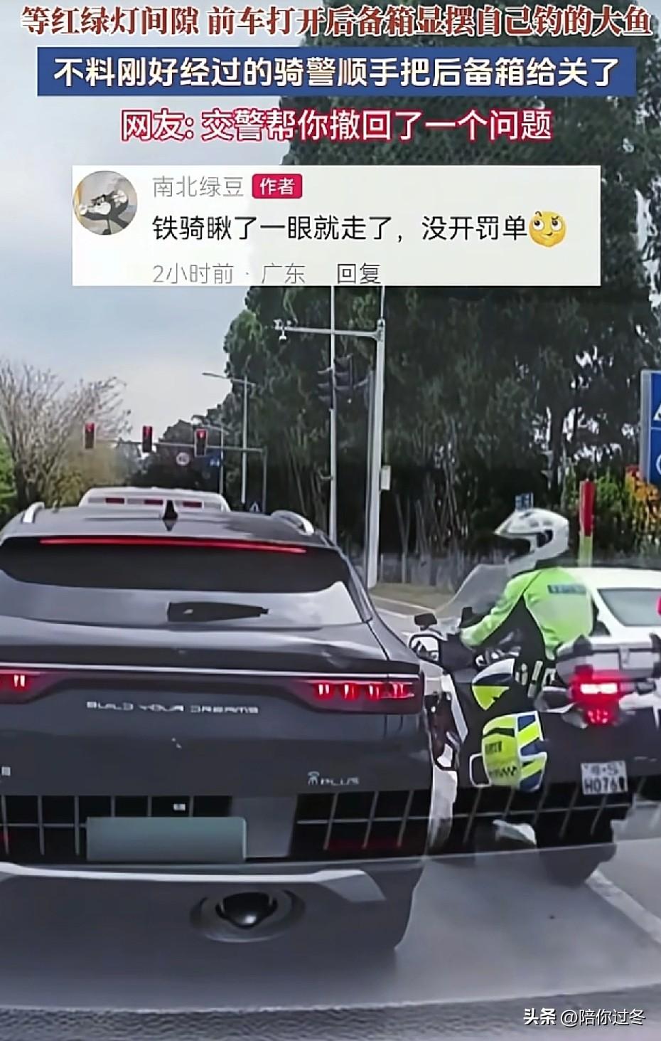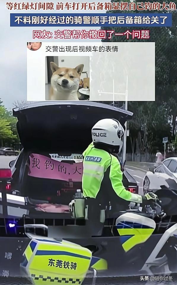“我钓的鱼大不大?”交警:看我怕不怕![捂脸] 央视新闻都转发了,男子钓大鱼炫耀失败,被交警逮个正着,现在全网都知道你钓了大鱼了!理解你钓到大鱼激动的心情,也同情你被罚时候的无奈![捂脸] 4月1日,广东某段公路上发生了一件令全网网友笑不停的事情。 在等红绿灯期间,前车一男子忽然打开电动后备箱,映入眼帘的一条红色横幅格外刺眼,写到“我钓的鱼大不大”,横幅下面确实是一条几十斤重的大鱼,应该是车主刚钓回来的。 看得出来这位钓友心情很是激动,本想借着等红灯期间,向后边车主炫耀一把,没想到后备箱刚打开交警就骑着摩托车从后面过来了,伸手直接把后备箱关上。 随后交警骑车来到车辆副驾旁,对其进行了一番批评教育。理解你钓到大鱼激动心情,但是行车过程中打开后备箱非常不安全,也是违法的。 该视频被网友发到网上后,引起众多网友调侃,车主:你罚我,扣我车我都认。但一定要全国通报批评!全网通报批评,车牌不打马赛克。[捂脸] 不得不说,网友们真的太有才了,真是看热闹不嫌事大呀![呲牙]