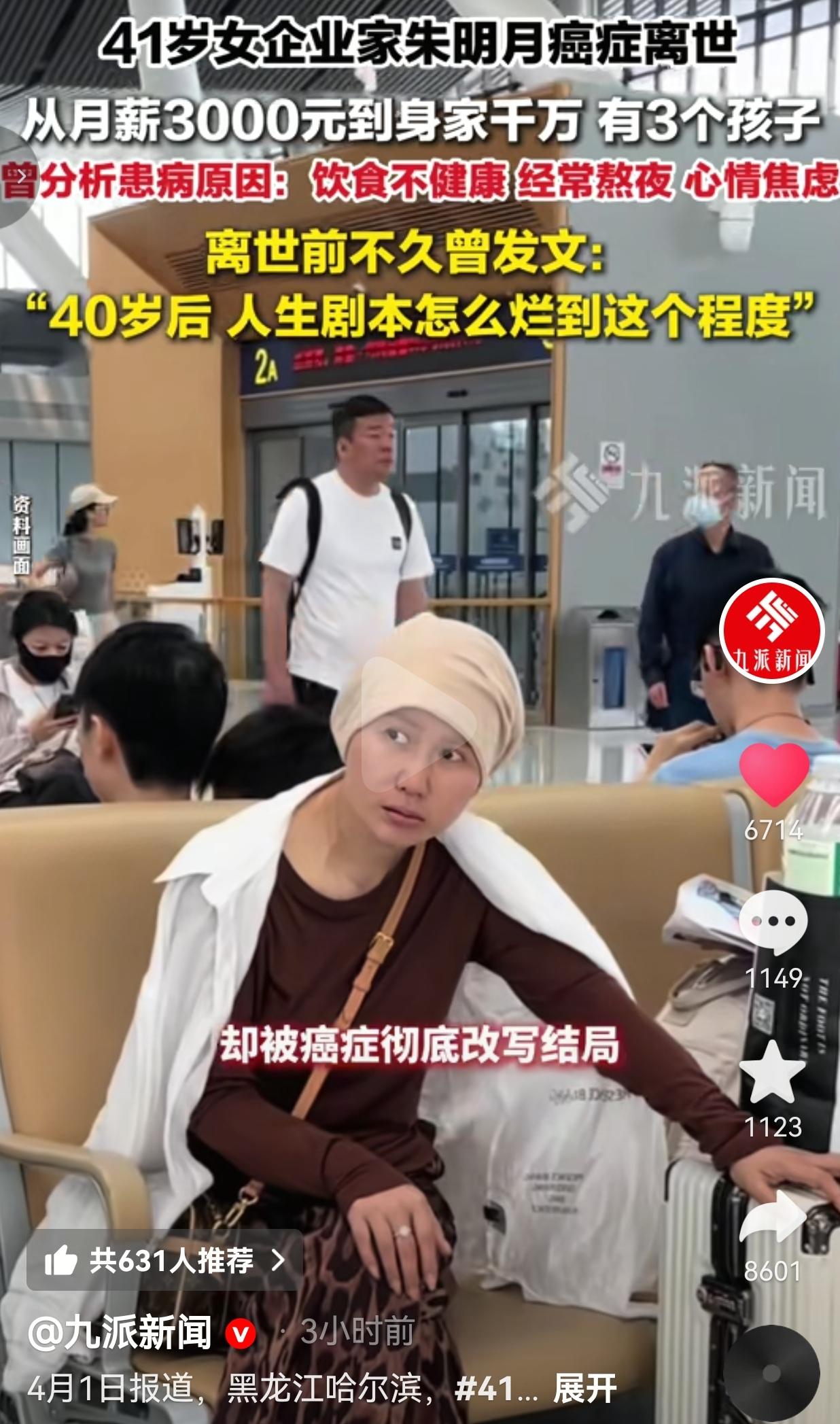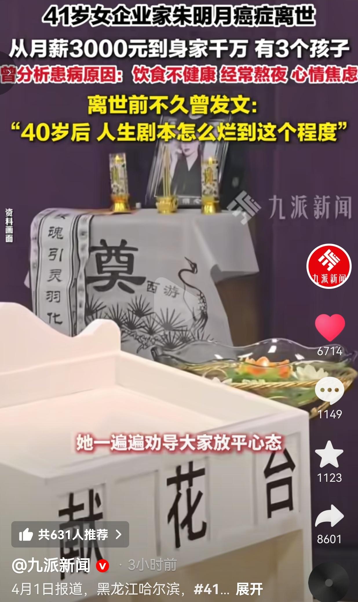 41岁千万身家女老板癌症离世,3个孩子没妈了!她死前一句话,戳中千万打工人的命门! 谁能想到,那个从月薪3000白手起家,10年拼出千万身家,带着3个孩子把日子过成别人羡慕的样子的哈尔滨女企业家朱明月,才41岁,就被癌症活活拖死了! 她从一个普通打工人,硬生生在10年里闯成了身家千万的老板,有房有车,有疼她的老公,有3个可爱的孩子,在外人眼里,这就是妥妥的人生赢家啊! 可谁能想到,40岁刚过,命运直接给她来了个釜底抽薪——2024年,她被确诊了腺泡型横纹肌肉瘤,一种极其凶险的恶性肿瘤。 从那之后,她的人生彻底坠入地狱。为了活下去,她经历了几十次化疗、放疗,头发掉光,身体被掏空,胸口留下狰狞的伤口,最后癌细胞扩散,双眼彻底失明,连说话都口齿不清,只能靠着药物勉强维持生命。 她自己复盘过生病的原因,每一条都像刀子一样扎在我们心上:一周至少4顿麻辣烫,晚上烧烤烤肉三四回,重油重盐的饮食,创业路上常年熬到凌晨的夜,还有压得人喘不过气的焦虑抑郁,每一条,都是我们当代打工人刻在骨子里的日常! 离世前不久,她发了一句让全网破防的话:“40岁后,人生剧本怎么烂到这个程度”。 3月30号,她的女儿在讣告里写下了妈妈的离开,那个曾经在讲台上意气风发、在镜头前自信满满的女强人,最终还是没能扛过病魔,留下3个还没长大的孩子,永远地走了。 灵堂里她的照片还笑得明媚,可那个鲜活的人,再也回不来了。她在生命的最后,还一遍遍劝导大家放平心态,别和自己较劲,好好爱自己,不熬夜不焦虑,可她自己,却再也没有机会好好爱自己了。 我刷到她的视频,真的看得眼泪止不住。你看她生病前,多漂亮、多有精气神,穿着职业装给员工培训,拿着产品自信分享,那是多少人羡慕的样子;可生病后,她戴着眼罩,瘦得脱了相,在病床上疼得直皱眉,最后连头发都没了,连好好吃一顿饭都成了奢望。 她才41岁啊,她的孩子还没长大,她的事业还没做完,她的人生才刚要享福,就这么没了! 网友看到后评论说:看完直接破防!我也是3个娃的妈,天天熬夜带娃、搞事业,焦虑得睡不着,看完她的事,今天直接请假在家睡了一天,钱再多,没命花有个屁用! 也有的网友说:这不就是我们的缩影吗?为了碎银几两,熬夜、焦虑、瞎吃,总觉得年轻扛得住,可癌症哪管你年轻不年轻!41岁,太可惜了! 还有的网友说:最心疼的是那3个孩子,以后再也没有妈妈了!钱赚再多,能换回妈妈吗?真的,别再拿命换钱了,身体垮了,家就散了! 我们总说“年轻就是资本”,总觉得“熬熬就过去了”,为了赚钱,为了养家,为了所谓的成功,把自己的身体当成铁打的。 熬夜加班、三餐不规律、顿顿重油重盐、长期焦虑、情绪内耗,我们把这些当成了“努力”的标配,把健康当成了可以无限透支的筹码。 我们总觉得麻辣烫、烧烤偶尔吃没事,熬夜熬到两三点补个觉就好,焦虑忍忍就过去了,可就是这些我们不在意的小事,一点点拖垮了我们的身体,最后给了我们致命一击。 可朱明月用她的命,给我们所有人敲了一个最响的警钟:在健康面前,所有的成功、所有的财富,都是零! 她从月薪3000到身家千万,靠的是拼命;可最后,也是拼命,把她的命给拼没了。 她有3个孩子,她是妈妈,是妻子,是老板,可她唯独忘了,她也是她自己,她也需要休息,需要好好吃饭,好好睡觉,好好爱自己。 她在生命的最后,用自己的血泪教训劝我们别和自己较劲,可我们呢?还在拿着健康换那碎银几两,还在透支着自己的生命,去追那些虚无缥缈的成功。 我们总在等,等赚够了钱就休息,等孩子长大了就享福,等事业稳定了就放松,可人生哪有那么多“等”?意外和明天,你永远不知道哪个先来。 朱明月才41岁,她的人生还有无数可能,可癌症没给她机会,没给她等的时间。她到最后,连好好抱抱自己的孩子,都成了奢望。 最让我破防的,是她最后那句“40岁后,人生剧本怎么烂到这个程度”。这哪里是她的剧本烂,是我们所有人,都在拿自己的人生剧本,去赌一个虚无缥缈的成功,却忘了,健康,才是人生的底线! 朱明月的离开,不是一个故事,是给我们所有人的警示。 别再拿命换钱了,别再熬夜了,别再顿顿重油重盐了,别再焦虑内耗了,别再把健康当儿戏了。钱没了可以再赚,事业没了可以再拼,可命没了,就什么都没了。 你的孩子需要妈妈,你的父母需要女儿,你的爱人需要伴侣,你自己,更需要一个健康的身体,去好好看看这个世界。 就像她最后劝我们的,放平心态,别和自己较劲,好好爱自己,不熬夜,不焦虑,好好吃饭,好好睡觉,这才是人生最该做的事。 你拼命赚来的千万身家,永远抵不过一个健康的身体;你所有的人生辉煌,都建立在“活着”这两个字上!