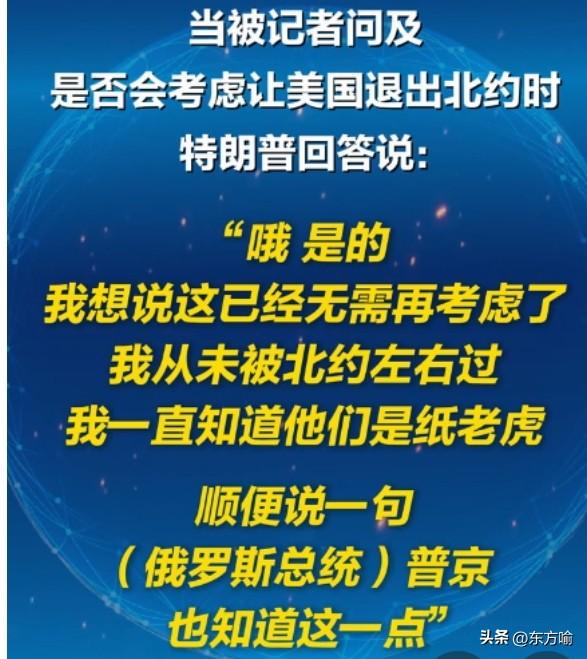 据外媒,特朗普再次说出北约“无用论”,退出北约已被排上日程,最佳时间可能就是对伊战结束。