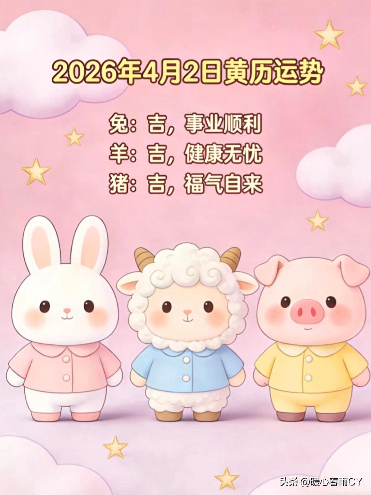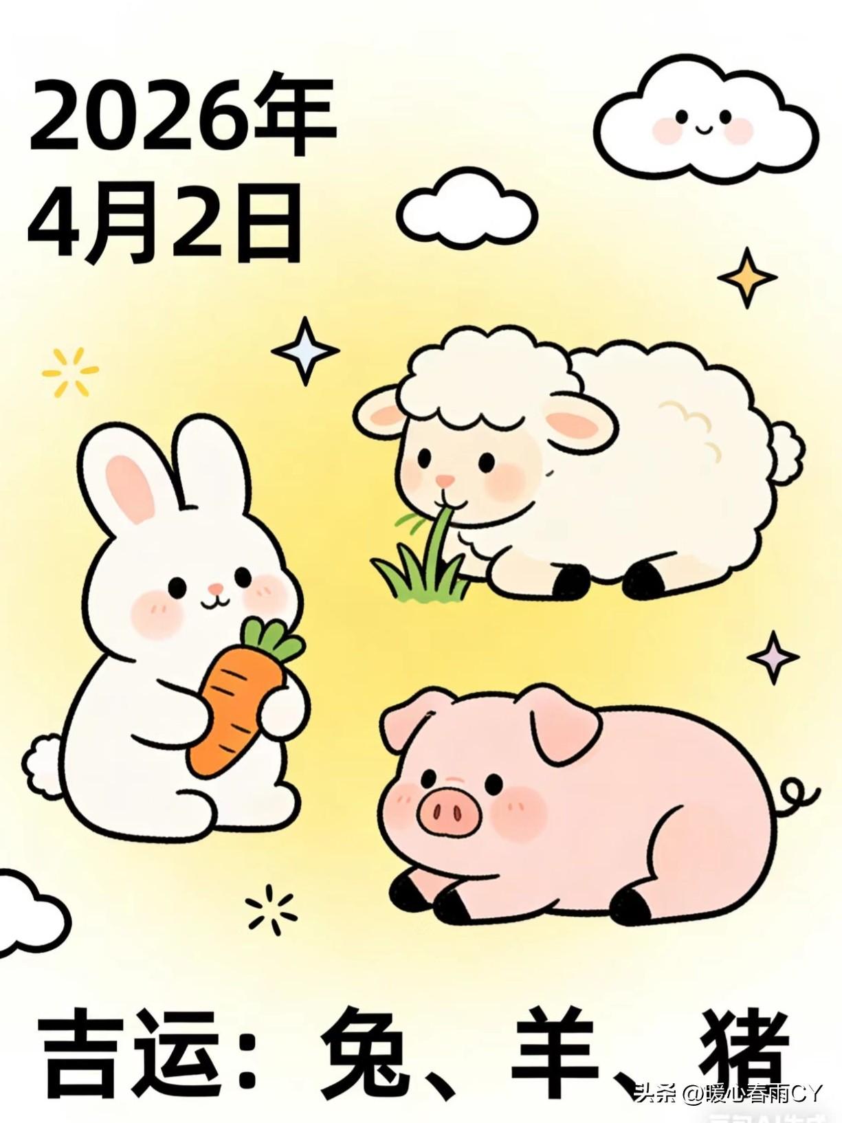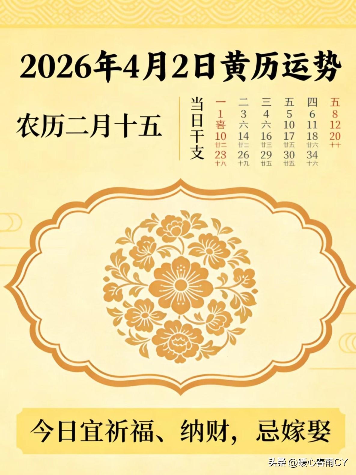 4月2日 周四运势|心气畅达,诸事安顺 💞 公历:2026年4月2日 农历:丙午年二月十五 星期四 【今日宜忌】📆 宜:祭祀、祈福、求嗣、开光、纳财、出行、开 市、交易✨ 忌:嫁娶、安葬、动土、破土❎ 【今日生肖提示】兔子🐰 吉:属兔、属羊、属猪🍀 人缘顺、心情平稳,适合出门、谈事、接贵人运 🍃 平:属鼠、属牛、属龙、属蛇、属马、属鸡 🌤️ 按部就班,稳中向好,小事顺利。 慎:属虎,属猴,属狗 不宜冲动决定,放慢节奏,少些争执,多点包容,万事顺遂。 【今日星座提示】星 ⭐ 旺:天秤,双鱼、巨蟹💗 桃花与人缘悄悄升温,容易被偏爱,被温柔照顾,处处遇善意。 顺:白羊、狮子、射手🔥精力充沛在线,做事效率满格,适合推进计划,攻克小目标。 稳:金牛,处女,摩羯,坚守本心踏实深耕,付出终有回报,收获将缓缓而至。 平:双子、水瓶、天蝎🌙 多沉下心思考、少内耗纠结,好运藏在平静的日常里。 四月第二日,清风轻柔,暖意融融,万事向好皆如愿。 不慌不忙,静待花开🌸 愿你日日平安顺遂,步步盈喜 🍵 十二生肖 十二星座 我要上精选-全民写作大赛 2026年运势