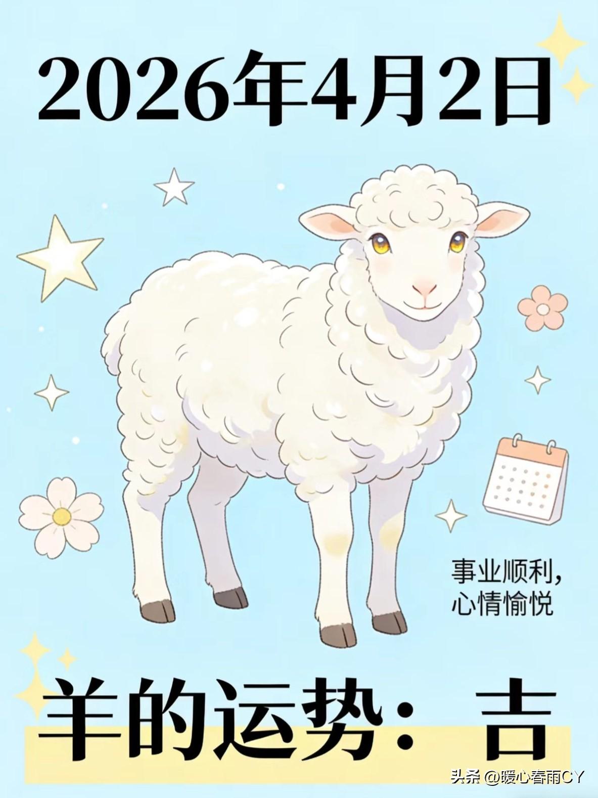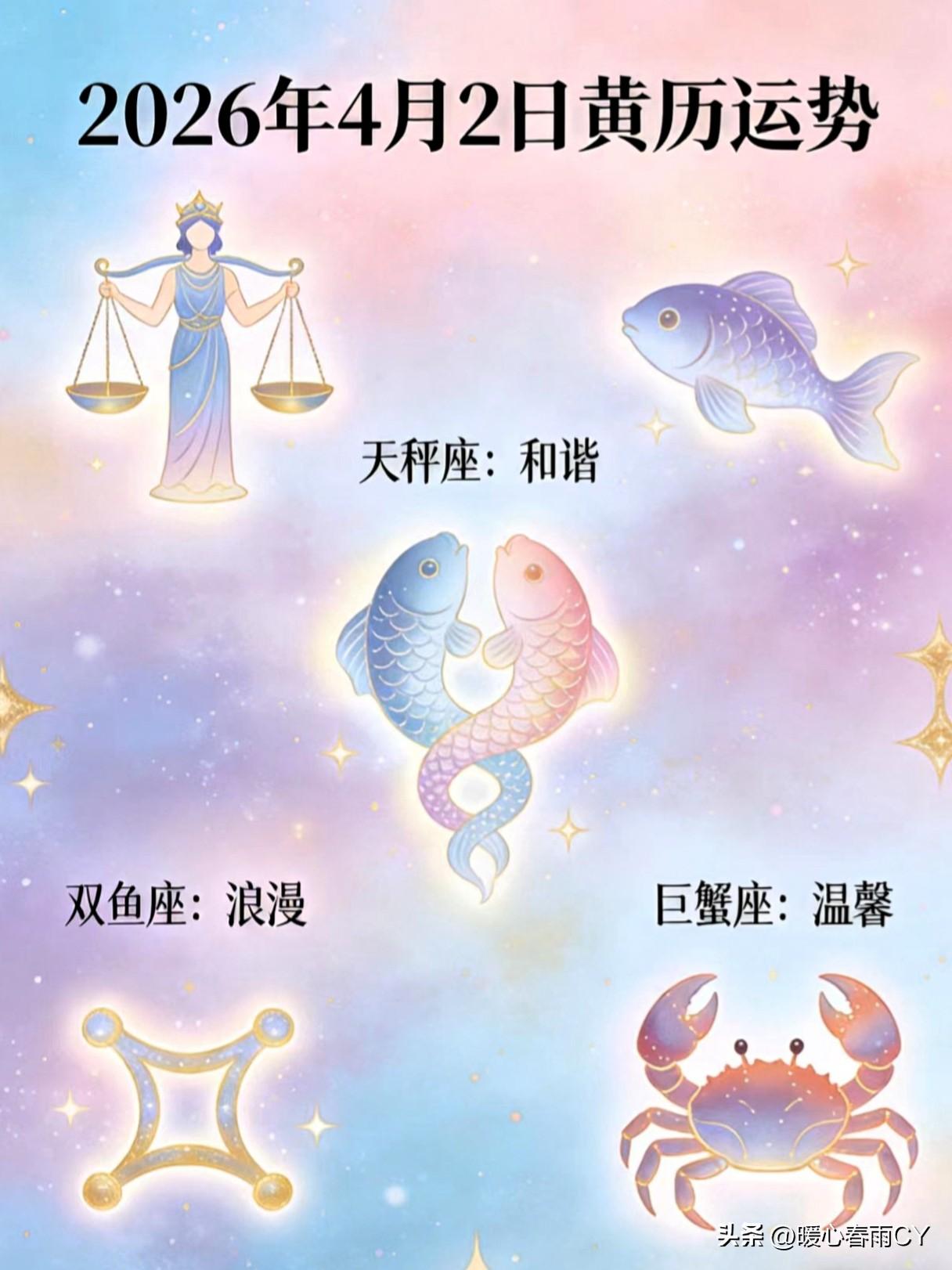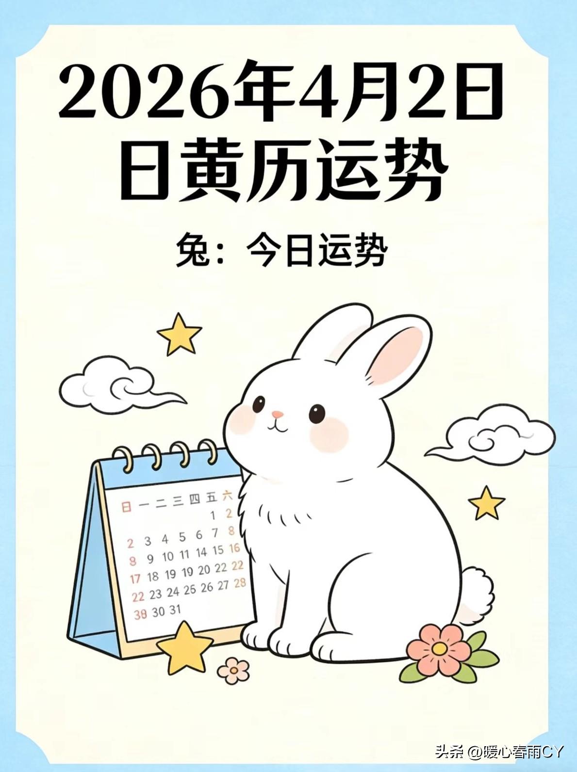 4月2日 周四运势|心气畅达,诸事安顺 💞 公历:2026年4月2日 农历:丙午年二月十五 星期四 【今日宜忌】📆 宜:祭祀、祈福、求嗣、开光、纳财、出行、开 市、交易✨ 忌:嫁娶、安葬、动土、破土❎ 【今日生肖提示】兔子🐰 吉:属兔、属羊、属猪🍀 人缘顺、心情平稳,适合出门、谈事、接贵人运 🍃 平:属鼠、属牛、属龙、属蛇、属马、属鸡 🌤️ 按部就班,稳中向好,小事顺利。 慎:属虎,属猴,属狗 不宜冲动决定,放慢节奏,少些争执,多点包容,万事顺遂。 【今日星座提示】星 ⭐ 旺:天秤,双鱼、巨蟹💗 桃花与人缘悄悄升温,容易被偏爱,被温柔照顾,处处遇善意。 顺:白羊、狮子、射手🔥精力充沛在线,做事效率满格,适合推进计划,攻克小目标。 稳:金牛,处女,摩羯,坚守本心踏实深耕,付出终有回报,收获将缓缓而至。 平:双子、水瓶、天蝎🌙 多沉下心思考、少内耗纠结,好运藏在平静的日常里。 四月第二日,清风轻柔,暖意融融,万事向好皆如愿。 不慌不忙,静待花开🌸 愿你日日平安顺遂,步步盈喜 🍵 十二生肖 十二星座 我要上精选-全民写作大赛 2026年运势