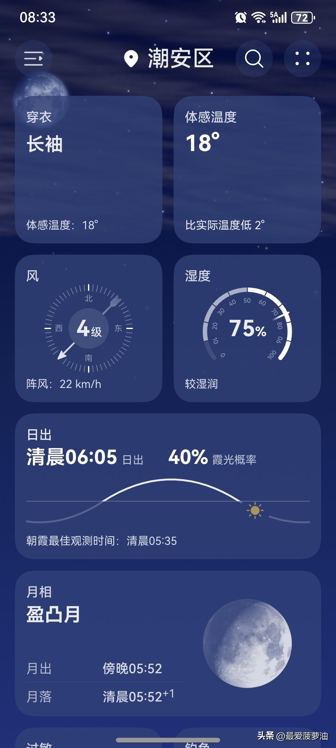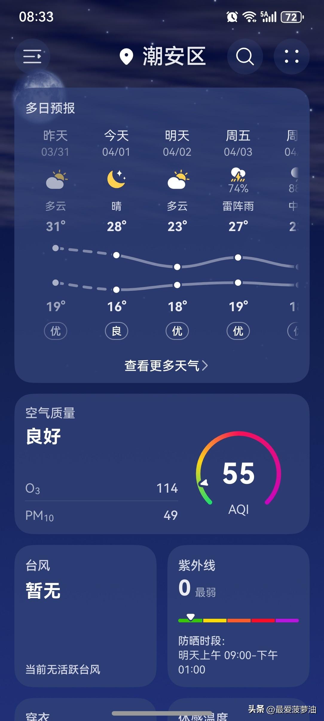 今天(1日),潮州喜提一个多云天气,气温16~28℃,此刻气温20℃,体感温度18℃。
