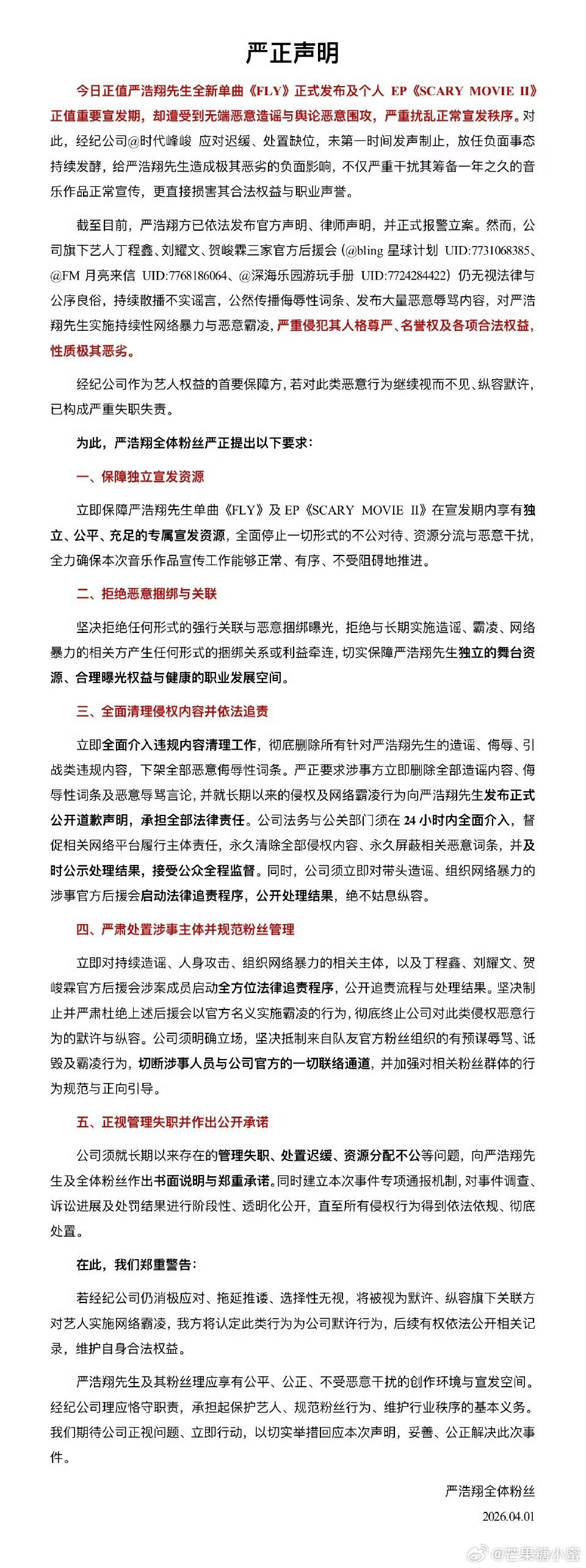 严浩翔后援会声明 严浩翔官方后援会发布了五项严正交涉,要求时代峰峻保障新专《FLY》《Scary Movie II》的专属宣发资源,拒绝与相关方利益牵连。还要求24小时下架造谣内容、追责,规范粉丝管理,并要求公司就管理失职问题作出书面说明,彻底解决侵权问题