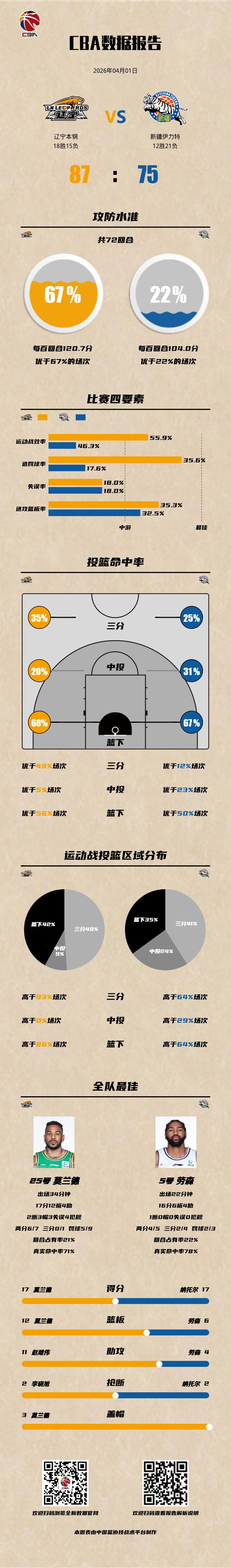 辽宁本钢 87-75 新疆伊力特 辽宁男篮vs新疆男篮 辽宁本钢:莫兰德17分12篮板4助攻2抢断3盖帽,鄢手骐16分3助攻2抢断,哈维16分; 新疆伊力特:纳托尔17分3篮板4助攻2抢断,劳森16分6篮板4助攻,阿不都沙拉木13分。以城之名