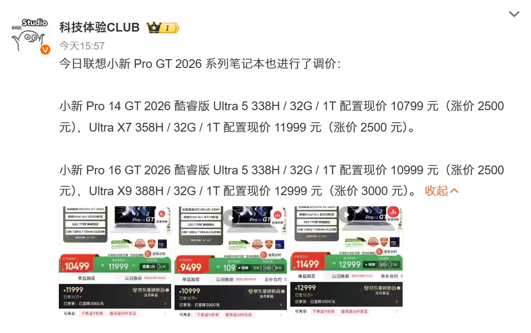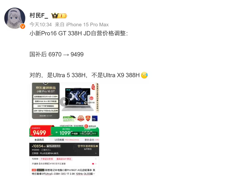家人们,听我一句劝,现在千万别冲涨价后的小新Pro GT!3月18号才刚开售的新品,这才半个月不到,直接全线暴涨,Ultra5版本从6970涨到9499,涨了2500,顶配更是涨了3000!这波操作纯纯就是割韭菜,现在入手完全就是冤大头。与其花这个冤枉钱,真的不如闭眼蹲荣耀2026款新品,不管是配置还是价格,肯定都比现在涨价后的小新香得多,没必要急着这一时。