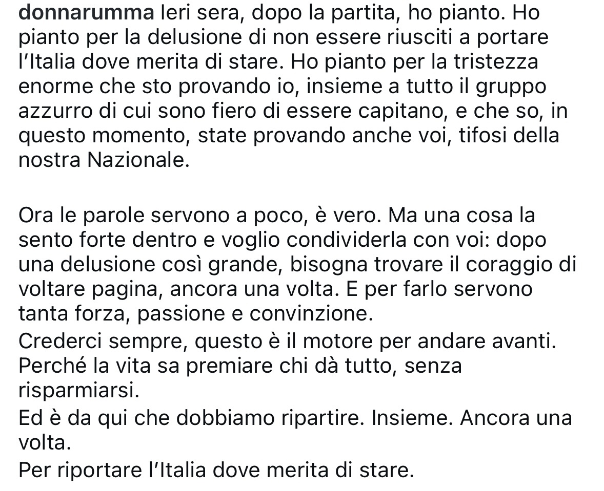 昨晚比赛结束后我哭了。我为没能把意大利带到理应属于它的高度而痛哭,为这份巨大的失落感而落泪。此刻我和整支蓝衣军团都沉浸在无尽的悲伤中。我为能担任这支球队的队长而无比自豪,而我也知道此刻的你们,我们国家队的球迷们也正承受着同样的痛苦。