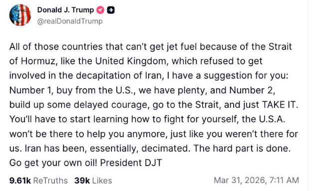 与此同时,特朗普声称封锁霍尔木兹海峡是其他国家的问题,这不过是在自欺欺人。特朗普对欧洲人说,如果他们缺乏“勇气”去获取所需的航空燃料(讽刺的是,规模更庞大的美军却没有去做这件事),他们可以“向美国购买,我们有很多”。