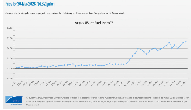 下面是美国主要机场航空燃料的平均价格变化: