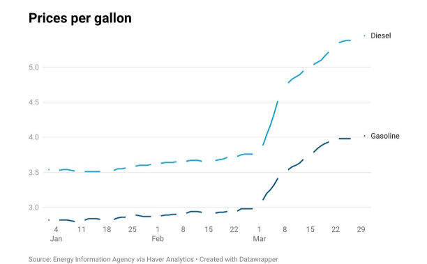 大多数非电动车使用汽油,但大多数卡车使用柴油。而柴油价格涨幅甚至超过汽油——大约每加仑上涨1.70美元,而汽油约上涨1美元: