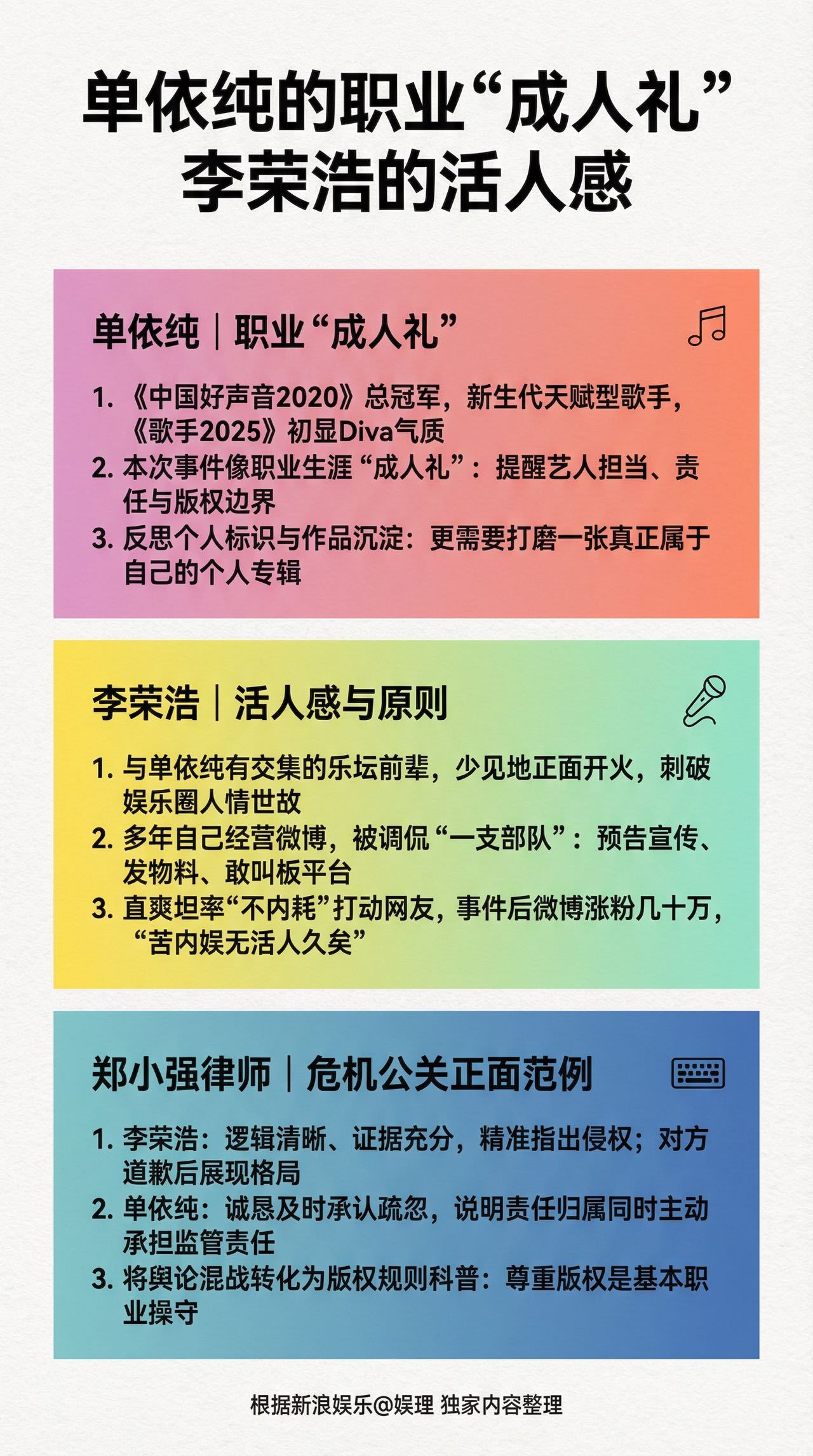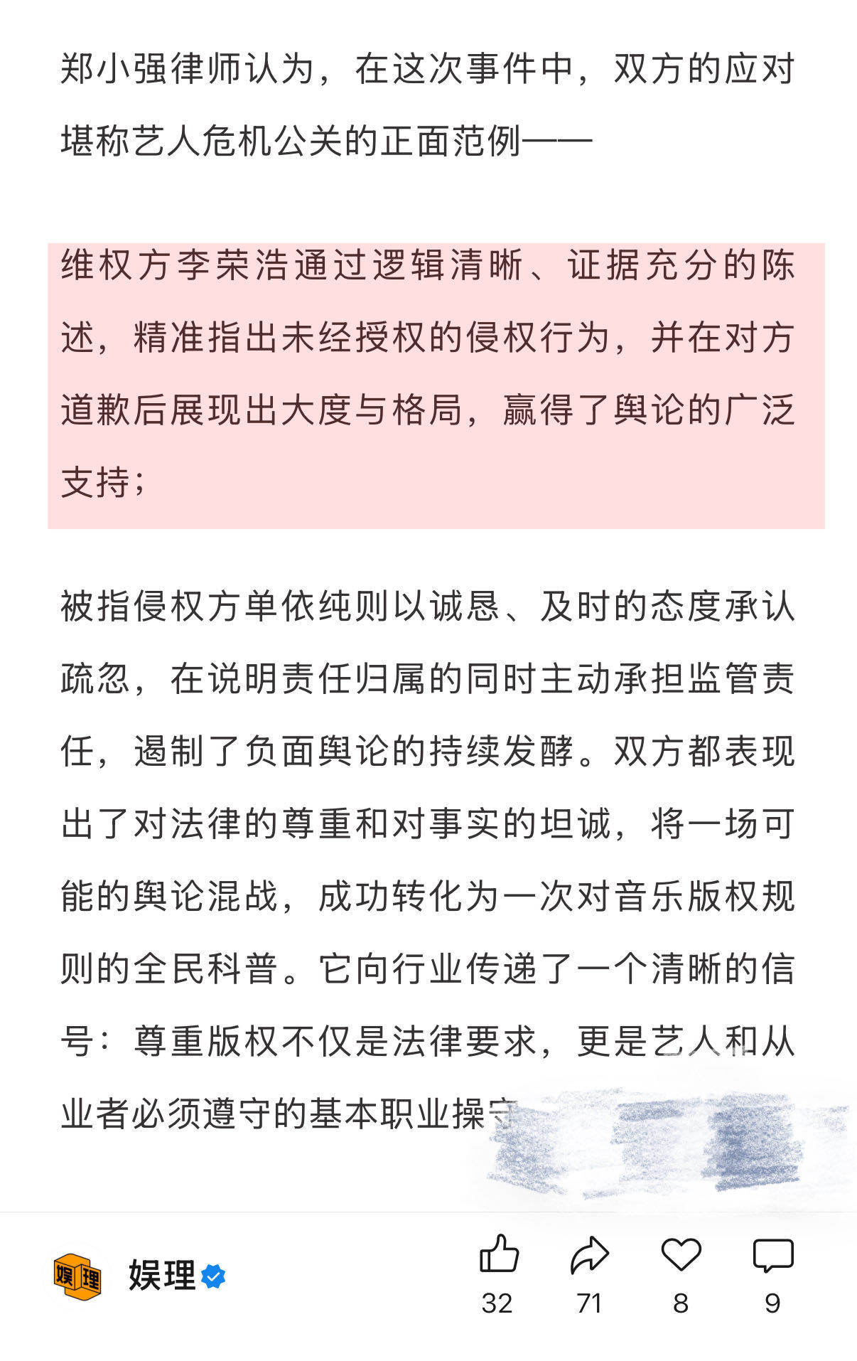 律师称音乐维权成本高于侵权成本 单依纯在《歌手2025》上唱的《李白》让这首歌再度爆火出圈!“我本是辅助,今晚来打野”、“如何呢、又能怎”符合当下网络青年的“美丽精神状态”,配合单依纯个人风格化的舞台表演动作,引爆了网络热度。但李荣浩最在意的不是赔偿金,而是他从心底就不喜欢、不认可这样的改编! 音乐版权先上车后补票现象