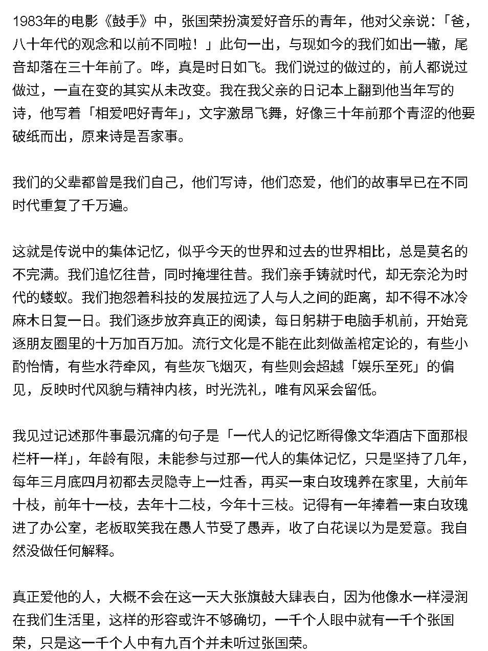 这大概是之前看到过的写得最好的一篇纪念张国荣的文章,在平淡的语气中却隐藏了最是情真意切的怀念。