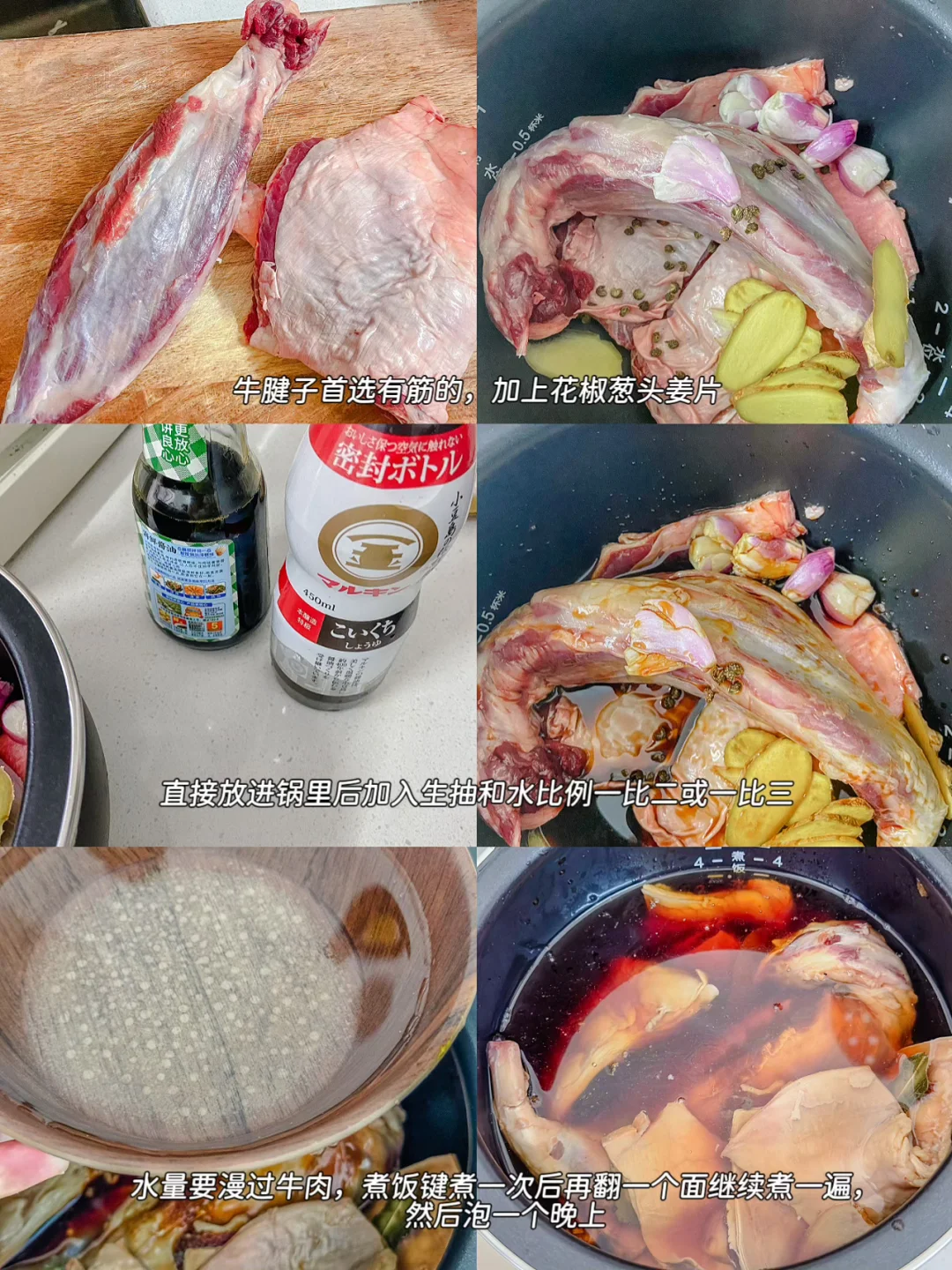 🧂食材: 牛腱子 1块(首选,有筋更好看好更好吃)、生抽(唯一调料)、水、姜、葱、花椒一点点 做法: 1.牛肉放进电饭锅里,加入生抽:水 = 1 : 3 (比如 100ml 生抽 + 300ml 水) 水量:刚好没过牛肉、可加: 姜片、一点点花椒、两片香叶(去腥) 2.按“煮饭键”两次 第一次煮饭结束有翻个面,第二次再按一次 3.重点来了,煮完千万别急着吃! 直接关盖泡 1小时以上(最好放凉再冷藏一晚)这一招决定、入味深不深、颜色漂不漂亮(很多人失败就是因为这一步没做)
