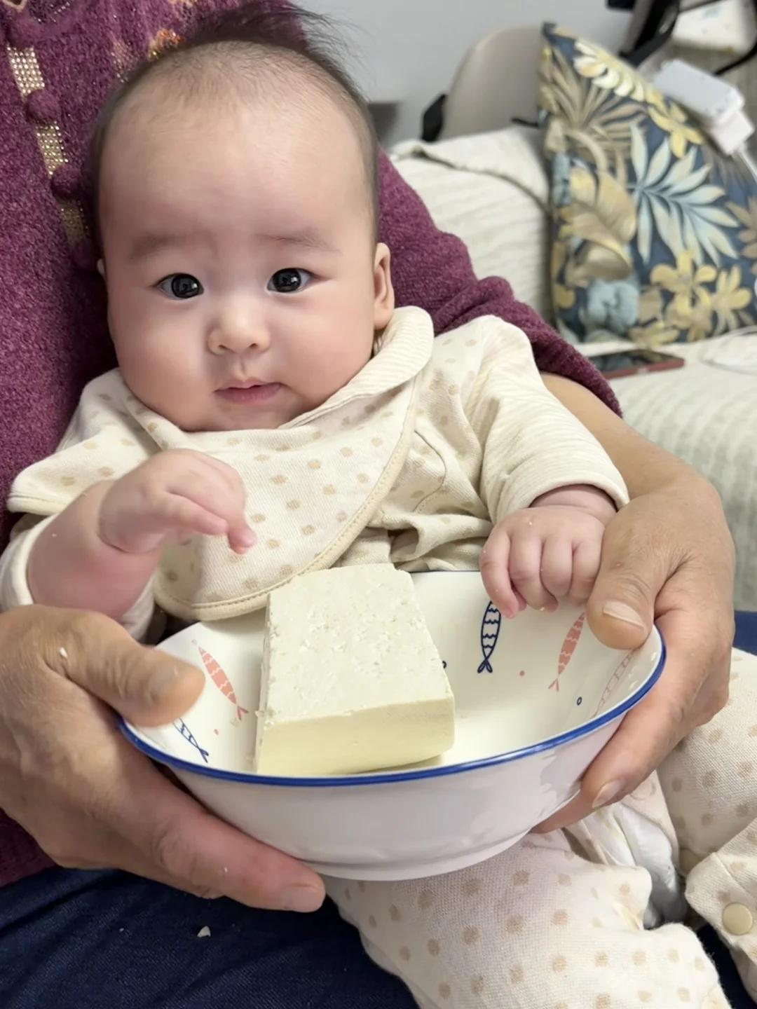 小孩抓握能力欠佳 奶奶买了块豆腐。奈何小孩不懂