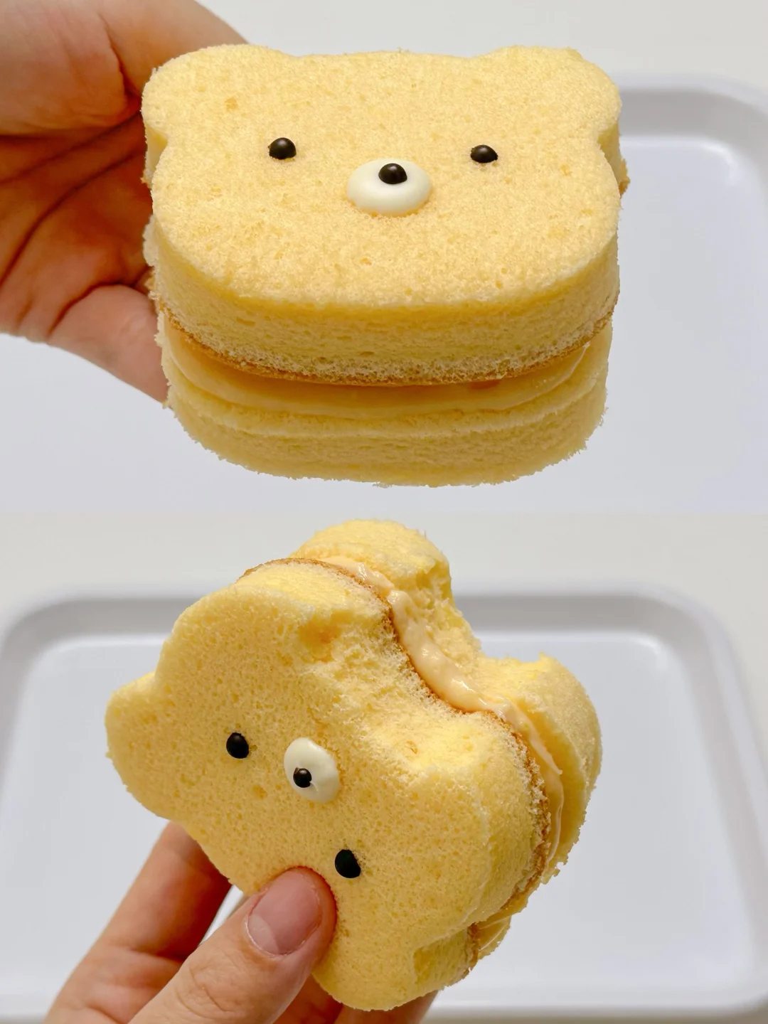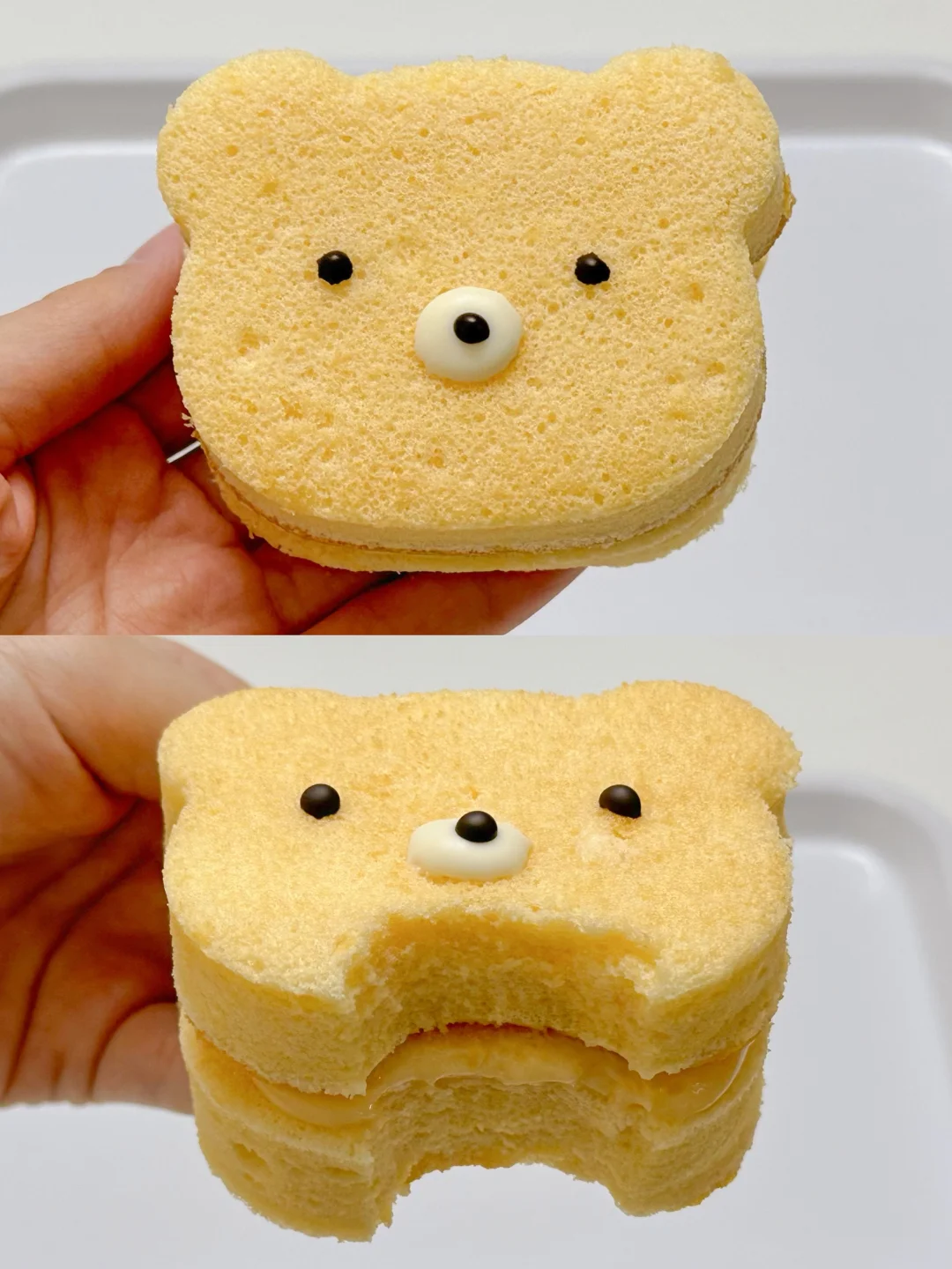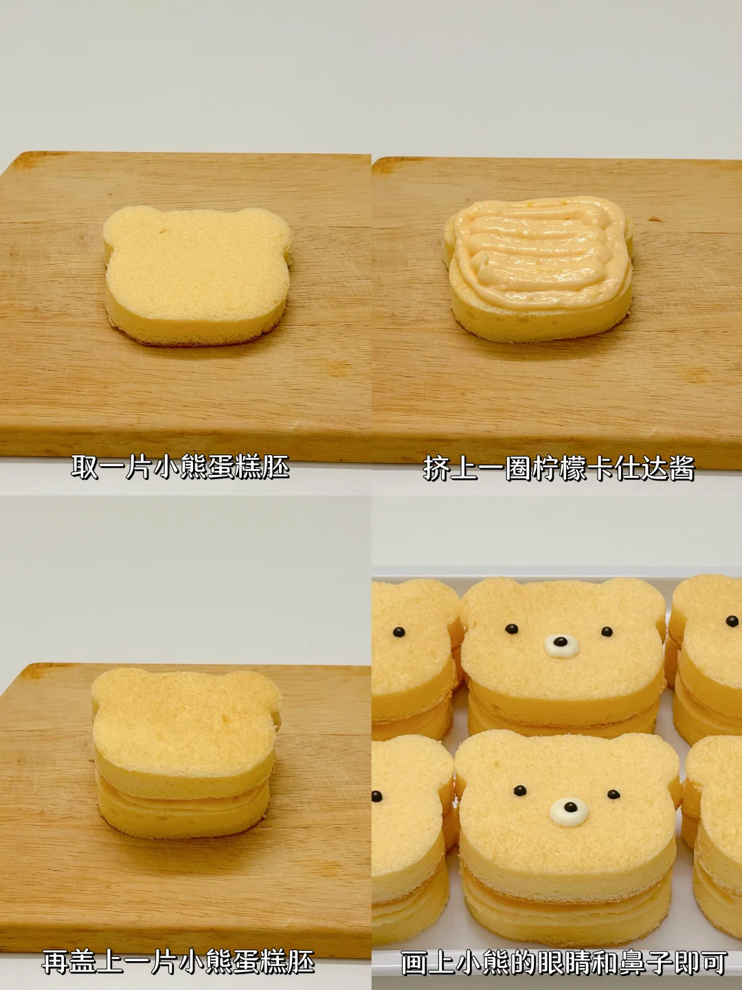 4️⃣蛋糕胚放凉翻面,用模具压出小熊造型,柠檬卡仕达酱打发均匀备用,蛋糕片+柠檬卡仕达酱+蛋糕片,再画上小熊的眼睛和鼻子即可。