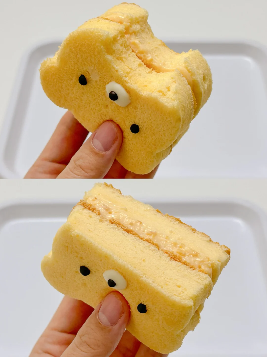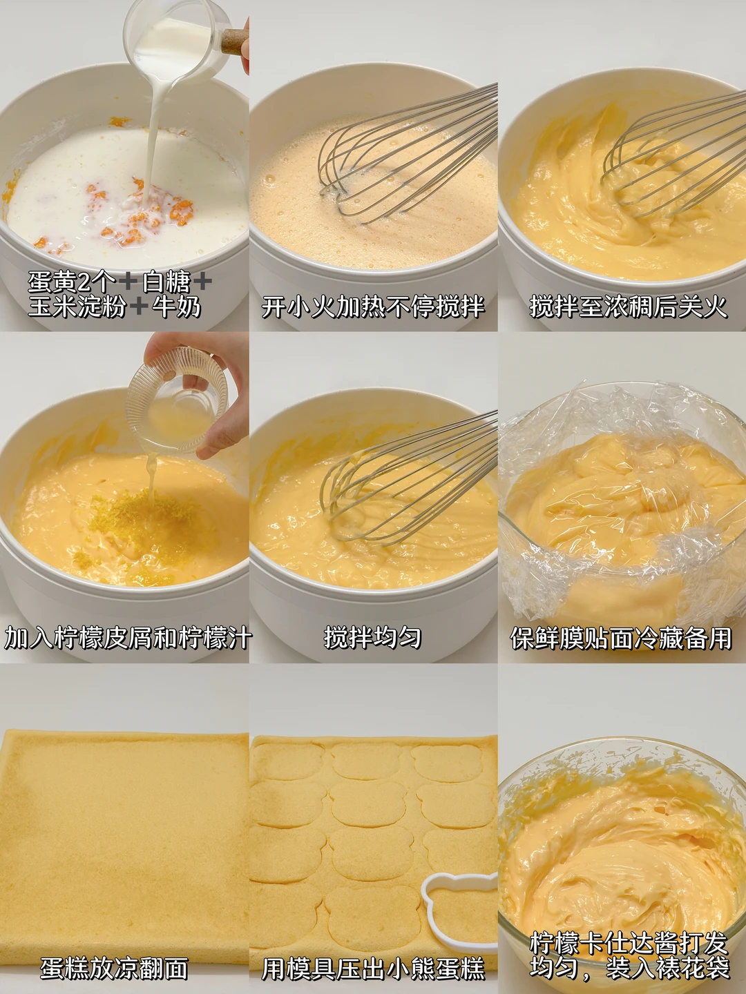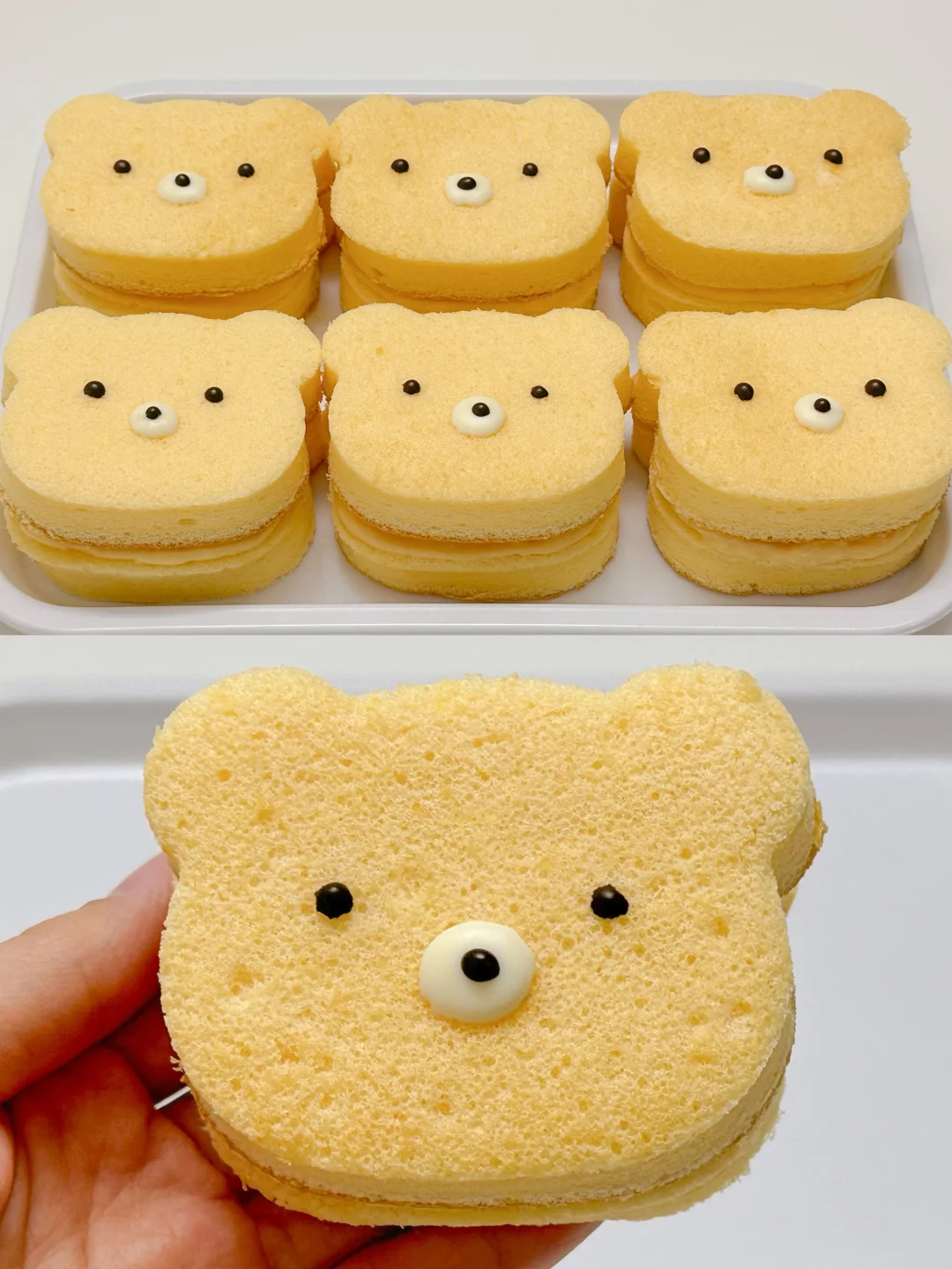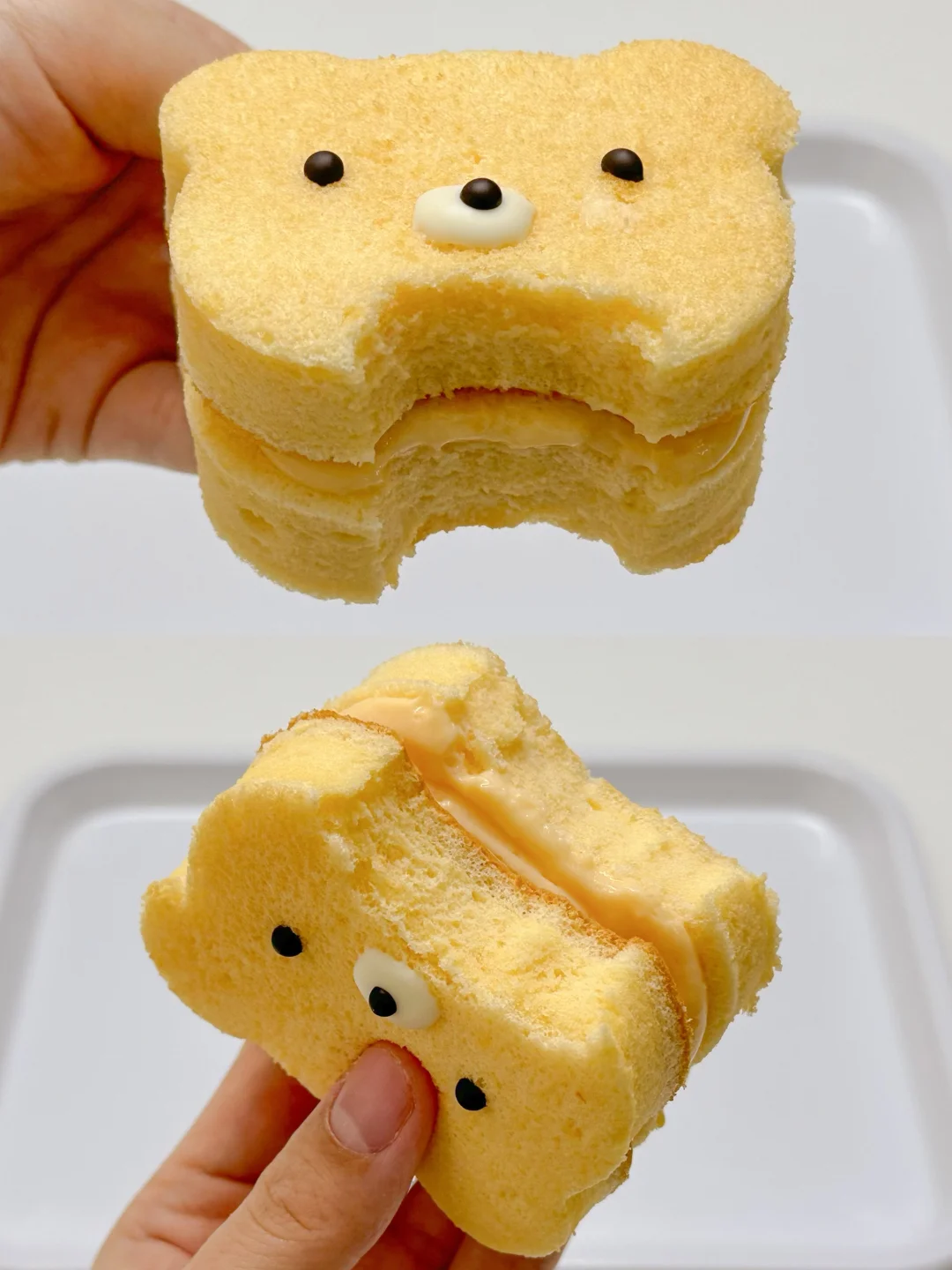 4️⃣蛋糕胚放凉翻面,用模具压出小熊造型,柠檬卡仕达酱打发均匀备用,蛋糕片+柠檬卡仕达酱+蛋糕片,再画上小熊的眼睛和鼻子即可。
