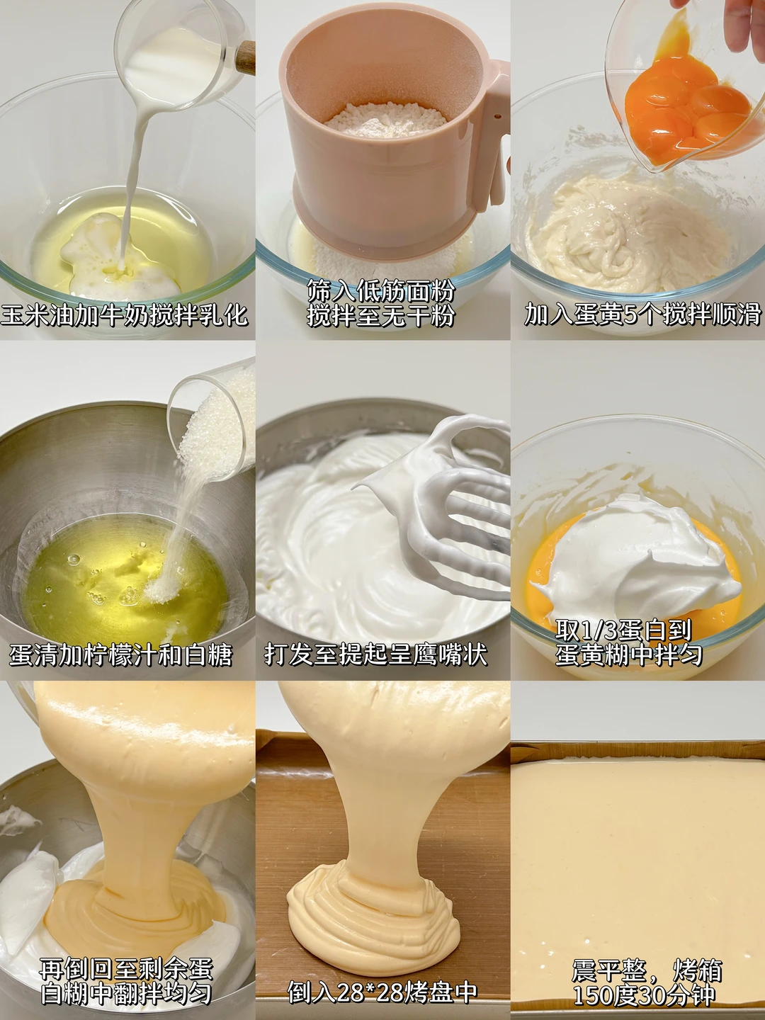 2️⃣蛋清加柠檬汁和白糖打发至提起呈鹰嘴状,取1/3蛋白到蛋黄糊中拌匀,再倒回至剩余蛋白糊中翻拌匀,倒入烤盘中,震平整,烤箱提前预热,150度30分钟。
