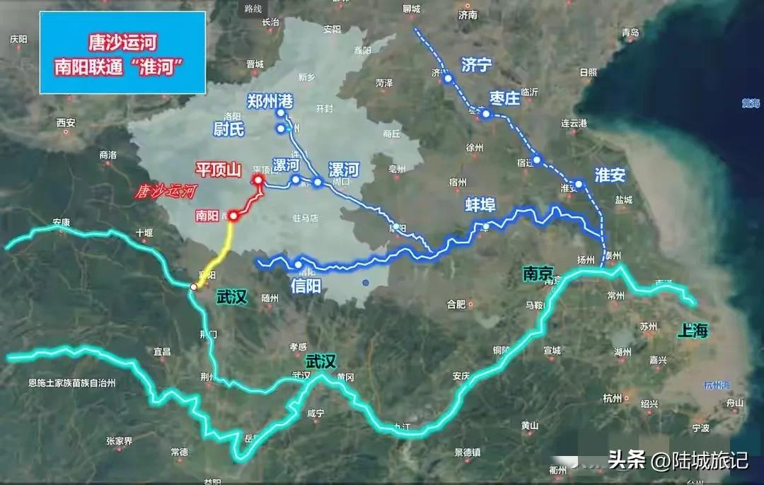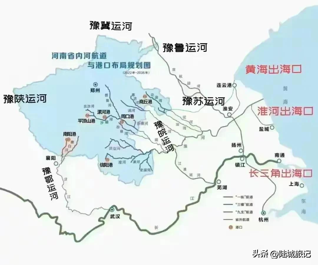 【中国河南:“内河航运工程”】: ①“豫皖运河”:这是河南目前重点打造的运河项目,其中打造“商丘港”,借助沱浍河、涡河进入淮河主航道,进出长江航道;开凿贾鲁河、沙颖河等河道进入淮河航道,构建“郑州港”、“平顶山港”、“漯河港”、“周口港”、“信阳港”。 ②“豫鄂运河”:开凿“唐白河”南下汉江航道,进入长江主航道。 ③“豫苏运河”:开凿横跨“河南、安徽、江苏”三省的运河航道,开凿“淮河出海口”。 ④“豫鲁运河”:河南开辟东出至“京杭大运河”,再北上山东“小清河航道”东出渤海湾。 ⑤“豫冀运河”:该运河借助海河水系进入“京杭大运河”北上京津冀地区。 ⑥“豫陕运河”:完成“渭河”的通航功能,同时推动河南洛阳至陕西西安之间的水运航线。 ⑦开辟北上“渤海湾出海口”;东出“淮河出海口”和“长江出海口”;南下“珠江出海口”和“北部湾出海口”的5个出海口联动项目工程。