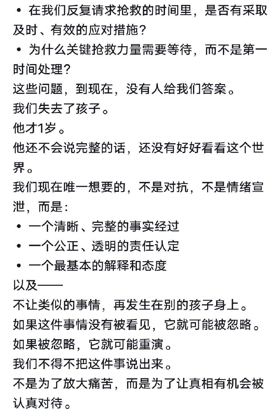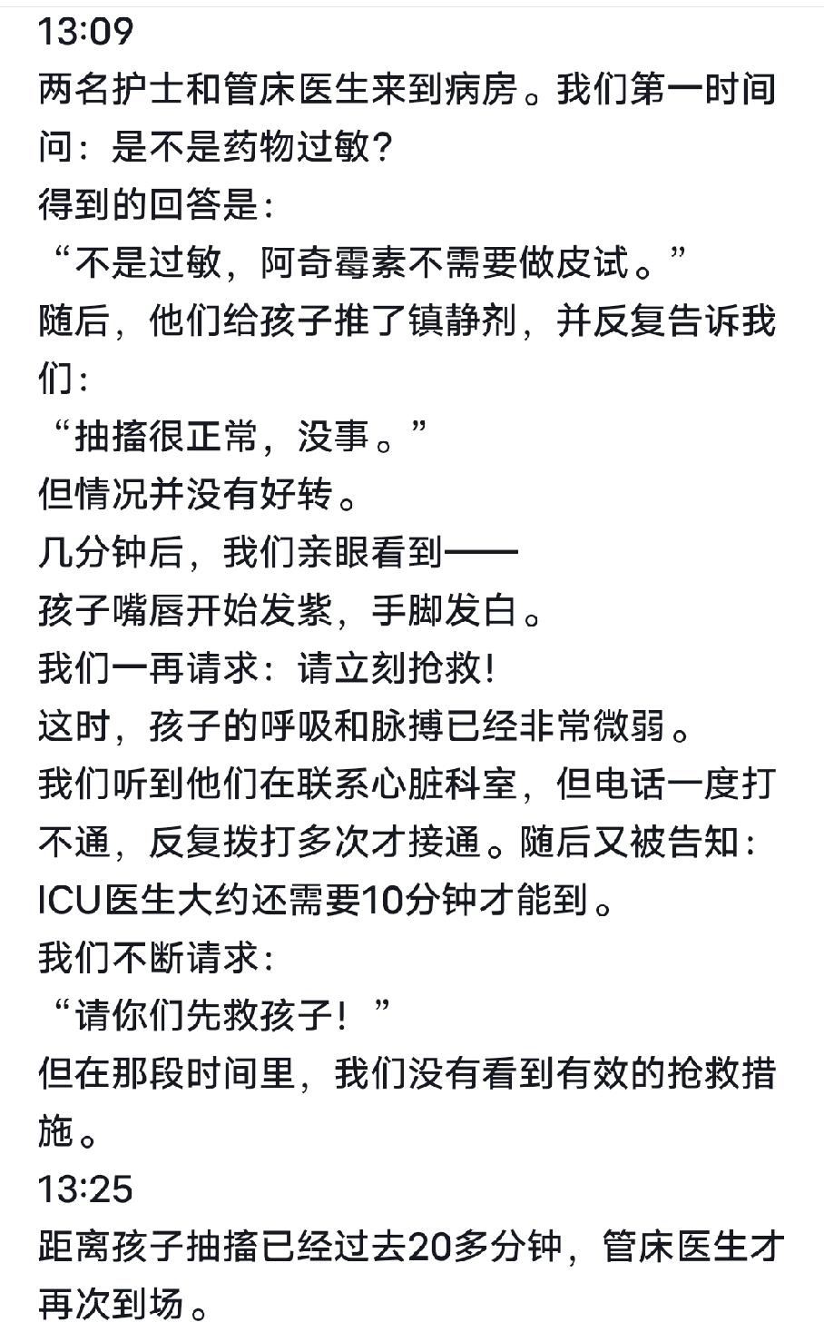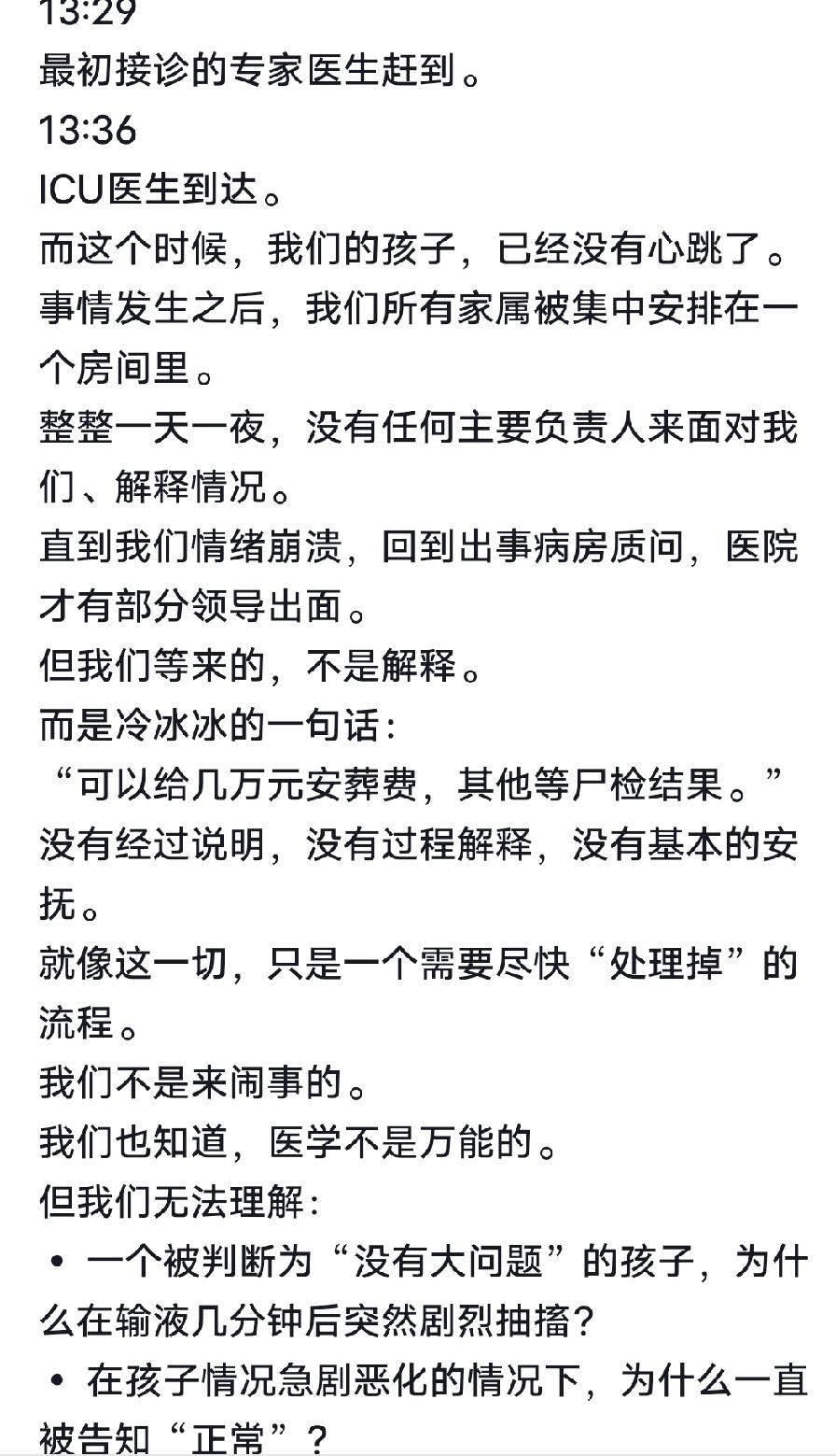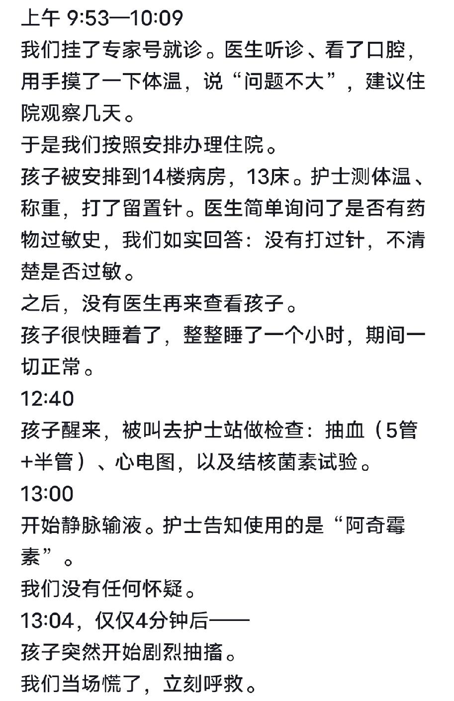 太痛心了! 1岁的男童输液仅4分钟后抽搐,抢救后不幸身亡,家属怀疑是药物过敏,医护人员却表示阿奇霉素无需皮试,抽搐属于正常现象。 有自称是孩子母亲的网友发布了孩子问诊的详细情况,据网友透露,由于孩子发烧咳嗽,孩子的妈妈便挂了专家号,经过医生诊断后给出的结果“问题不大,住院观察”,结果孩子从9点53分就医到下午1点36分进行抢救,短短3个多小时就天人永隔。 孩子突然的离去,最难过的肯定就是孩子的父母,据孩子的妈妈透露,他们是好不容才怀上这个孩子,没成想却发生了这样的事,孩子究竟是药物过敏、医疗事故、还是其它原因,目前还在调查中,但我们更不希望再发生类似的事情,追责也好,调查也罢,也难以抚平孩子家属心里的创伤和失去孩子的痛苦