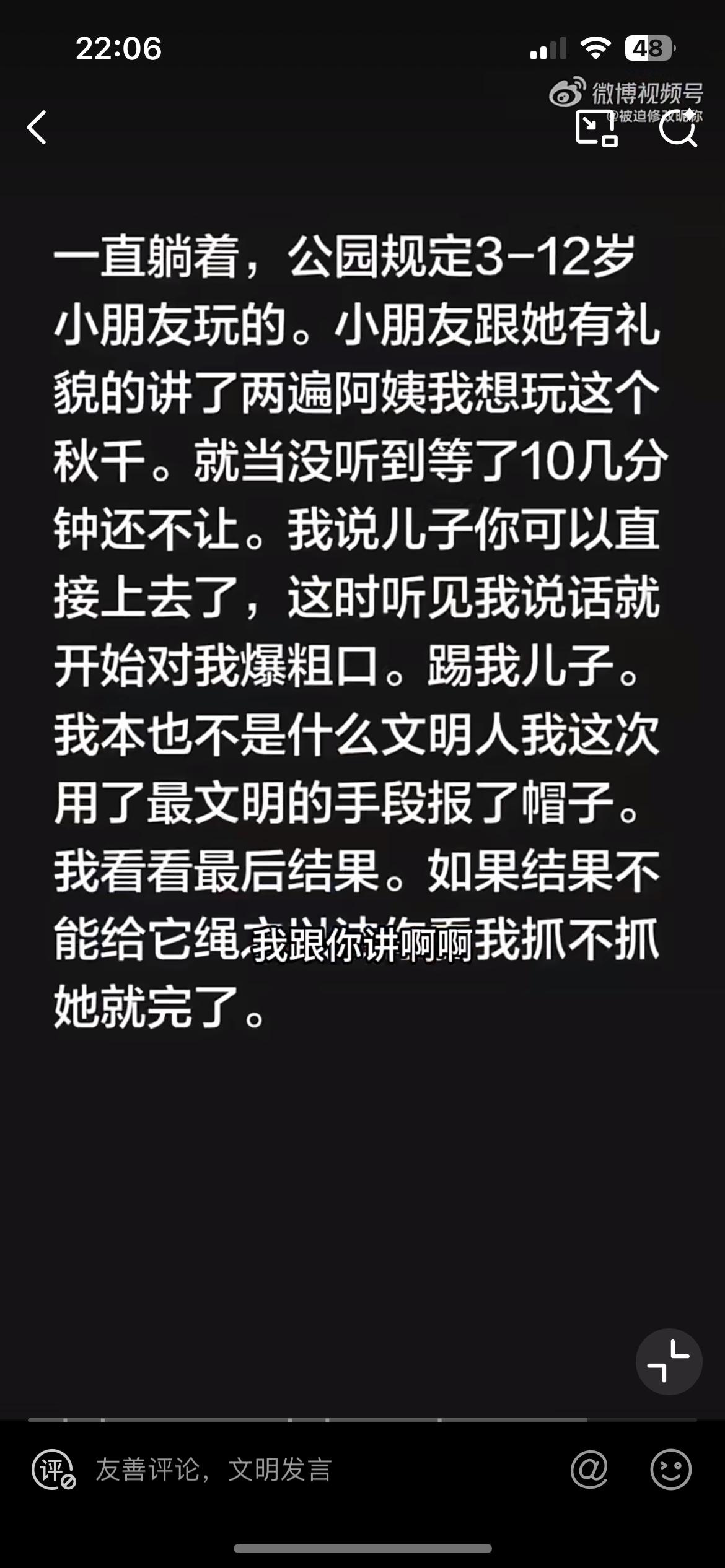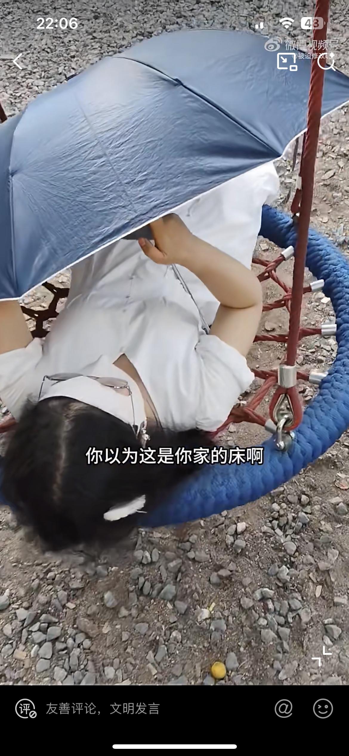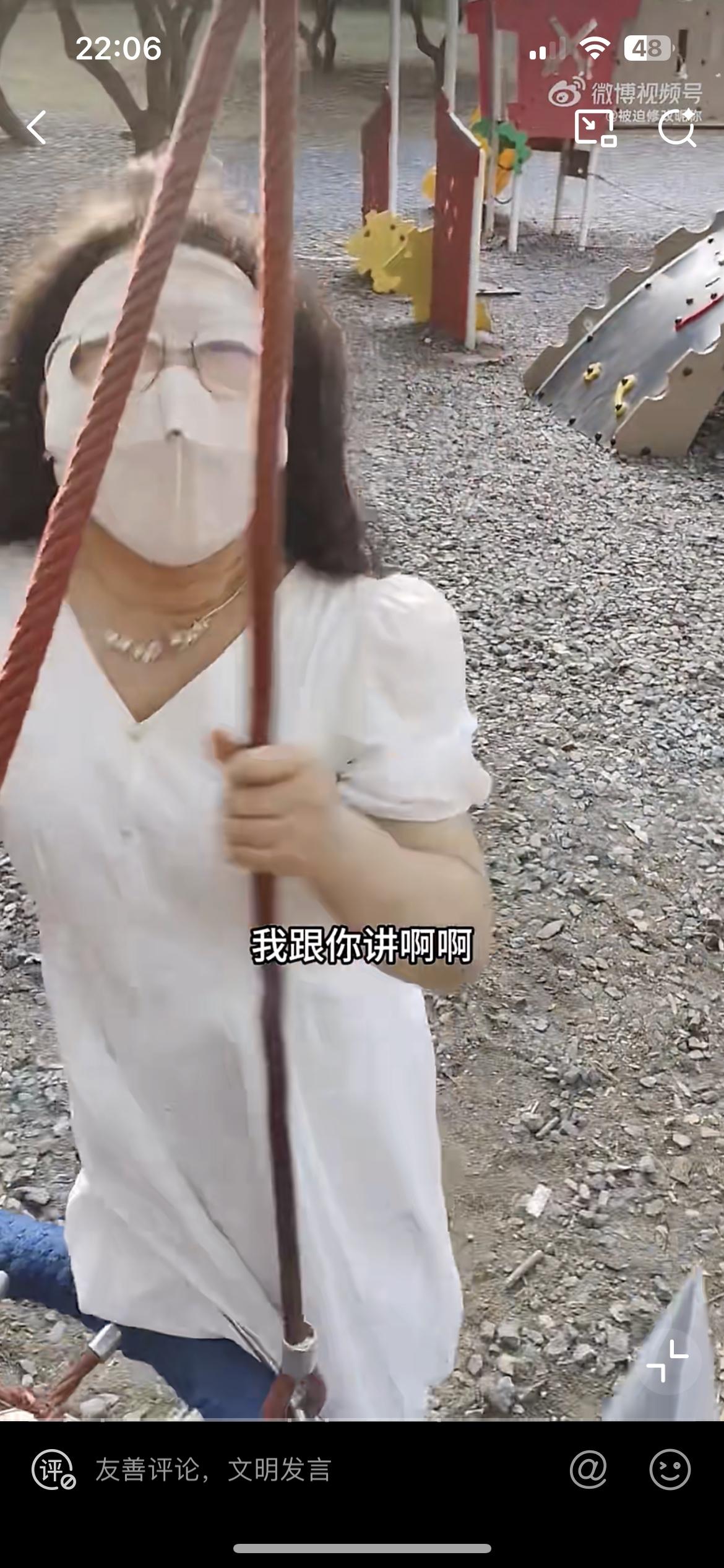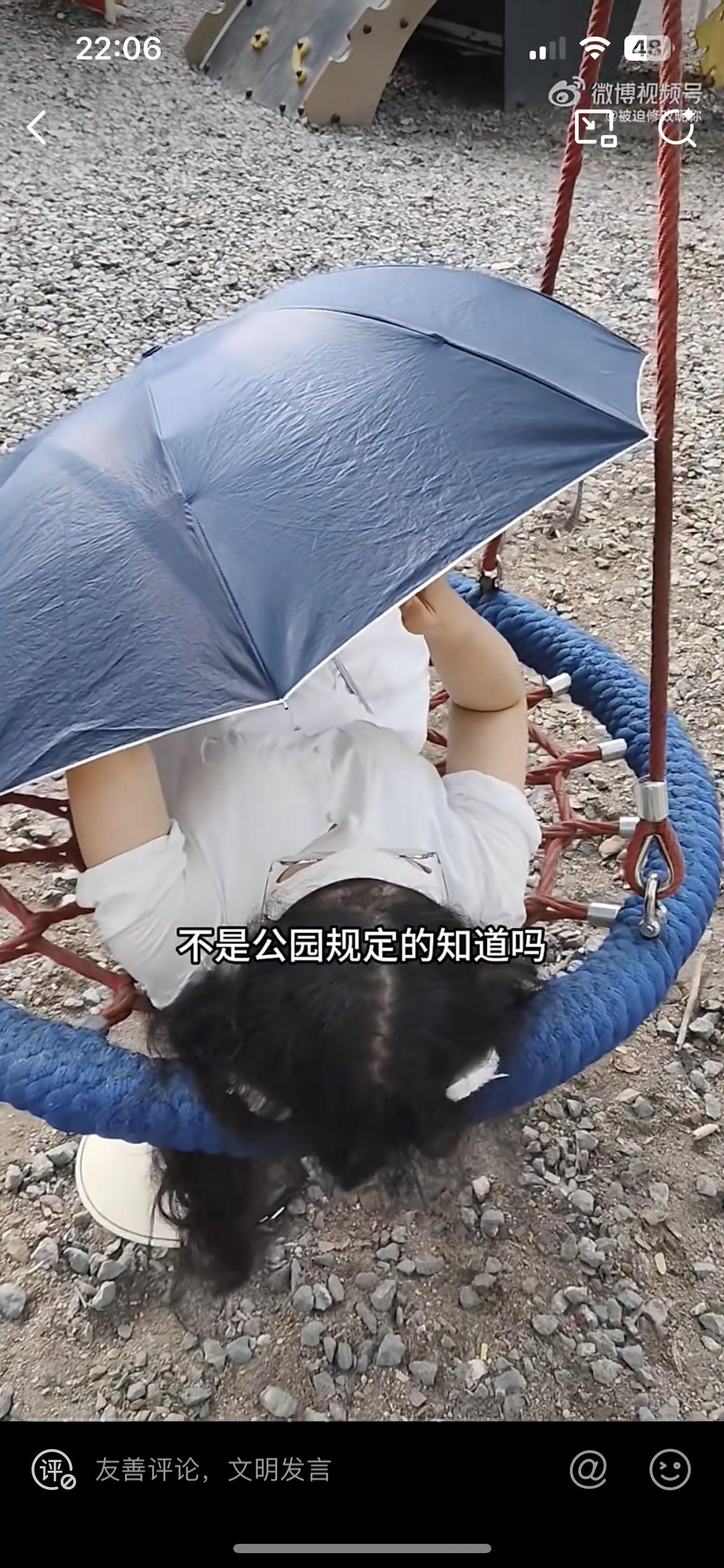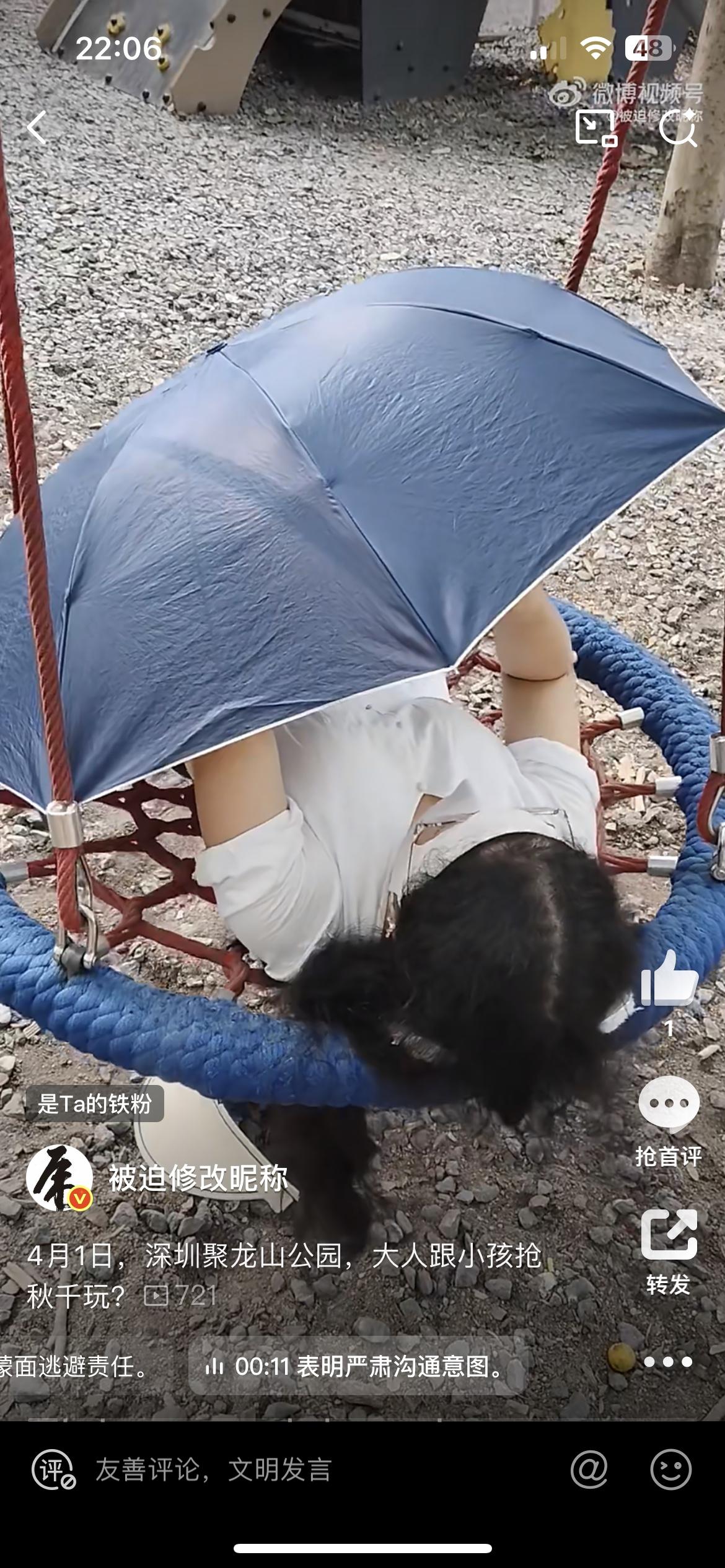 老阿姨长时间霸着儿童公园的秋千,有个小朋友想玩一下,和她商量让她让位,没想到老阿姨一下爆起。这是深圳聚龙公园的儿童乐园,有一个绳编的秋千,主要是给 12 岁以下的儿童玩耍。这个老阿姨一个人躺在秋千的座椅上,打着太阳伞,脸上盖着罩子,遮得严严实实,在那里养精蓄锐,刷手机,非常的惬意。有个小朋友想过去玩,惹怒了老阿姨,老阿姨直接要踢打这个小朋友,小朋友的家长也不是好惹的,直接和老阿姨干起来。