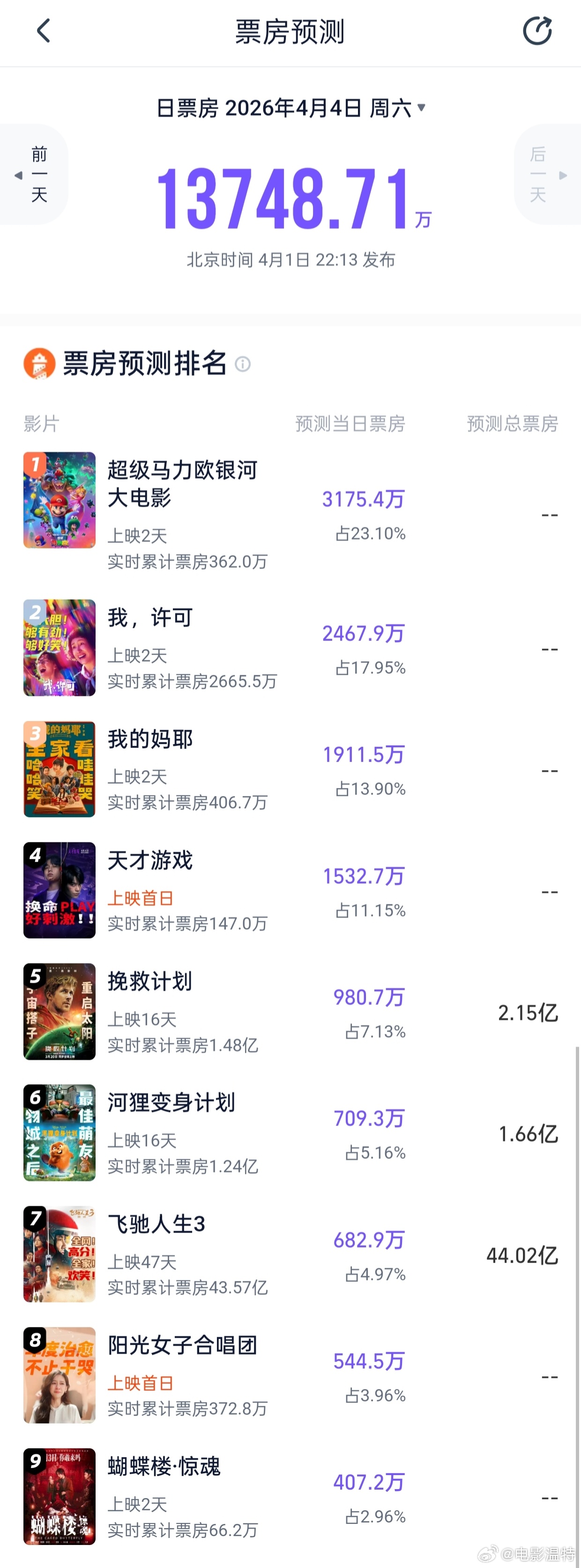 听听温特怎么说 猫眼灯塔专业预测清明档首日票房1.1亿到1.137亿。《马里奥》
