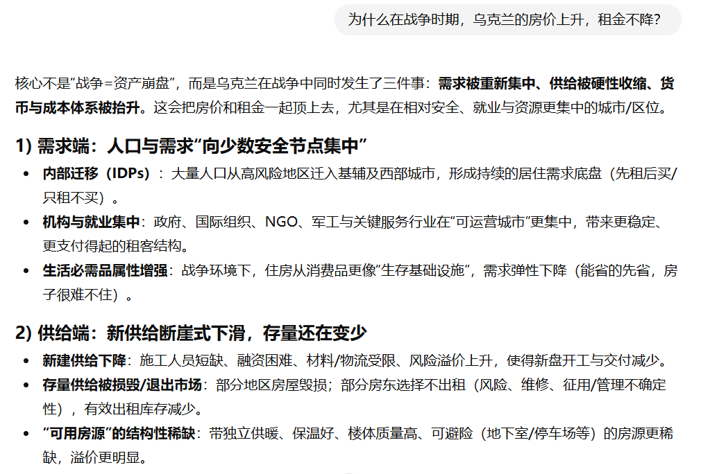 为什么战争时期乌克兰的房价上涨,租金不降,GPT回答: