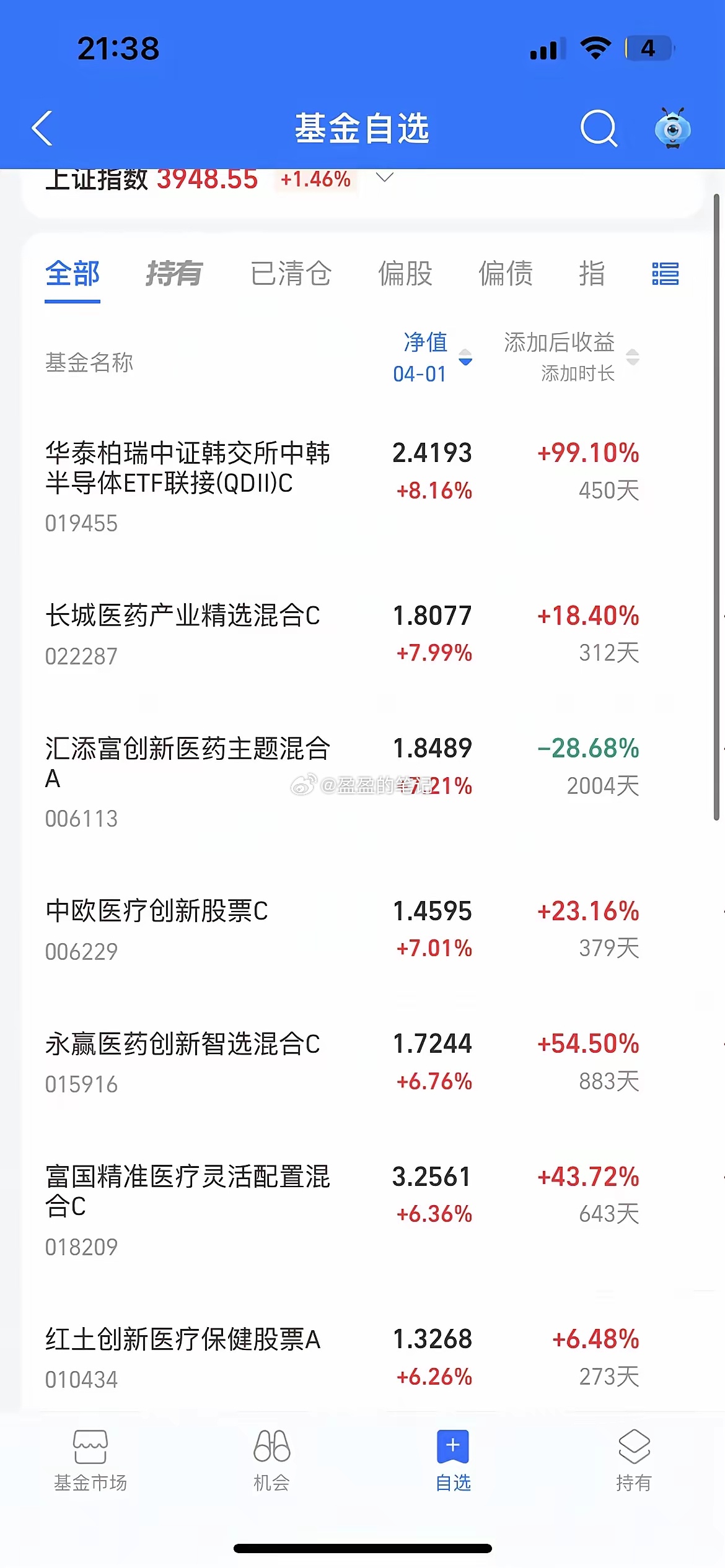今天创新药人赢麻了,今晚长城医药更新大涨近8%,汇添富医药更新大涨超7%,永赢医药和富国医药更新大涨超6%,这几天创新药表现确实超预期,连着涨了4天,累计涨幅超12%,估计好多人又以为医药人的春天要来了,不过目前我认为医药更多的超跌反弹为主,其实回过历史前几次,每次市场低迷的时候,创新药都能站出来顶几天,主要它调整时间空间比较充分,有时又属于银行一类的防御品种,而且近期医药几家龙头披露的业绩都还不错,所以创新药深受资金青睐,反复活跃,而一旦市场情绪回暖,科技股起来,它又没影了,所以我是不建议大家去追,当然短期不排除它依旧会延续强势,所以在车上的可以继续持有,想上车的等它回调想再去介入。除了创新药,今天表现最亮眼的就属半导体,今晚中韩半导体大涨超8%,德邦半导体更新大涨近4%,金信半导体大涨近3%,存储先锋不及预期,涨了不到2%,主要还是德明不给力,开盘一度涨停,随后一泻千里,不过这个方向也没啥问题,有业绩支撑涨价逻辑还在,其实我当下最看好的依旧是芯片半导体,因为这轮它调整跌的最多,而且每次市场情绪要想起来,都得靠它和CPO来带,现在看随着外围局势缓和,风险偏好回升,跌的多的方向自然深受资金青睐,而且它本身逻辑基本面都没啥大问题,所以半导体和科创50这个方向,接下来大家可以适当留意一下。点赞就是对阳哥最大支持!