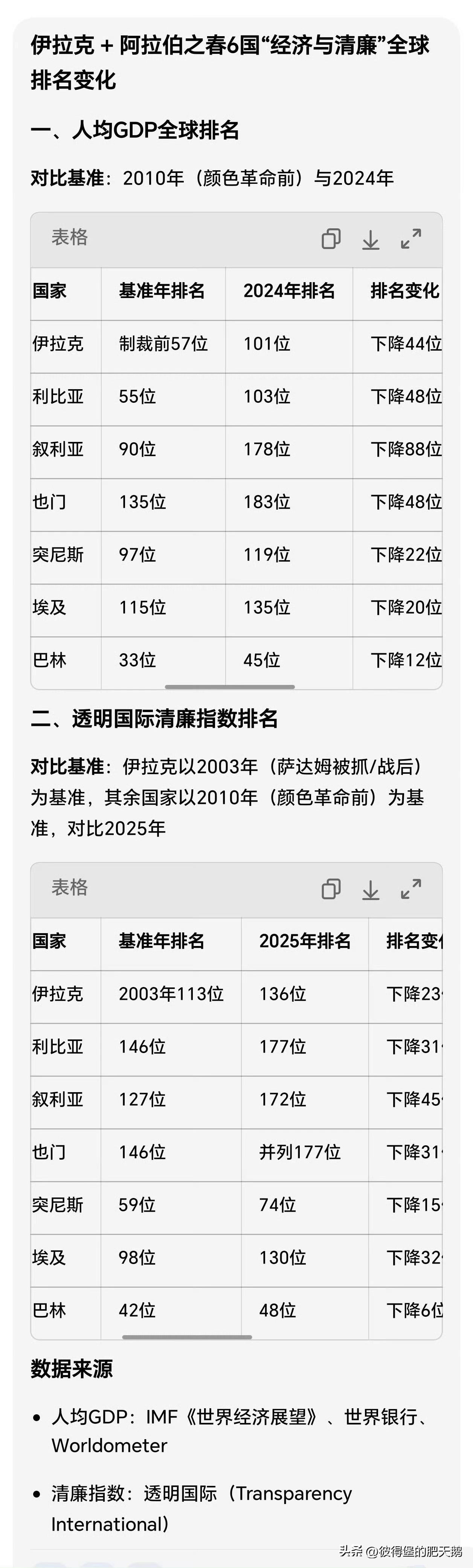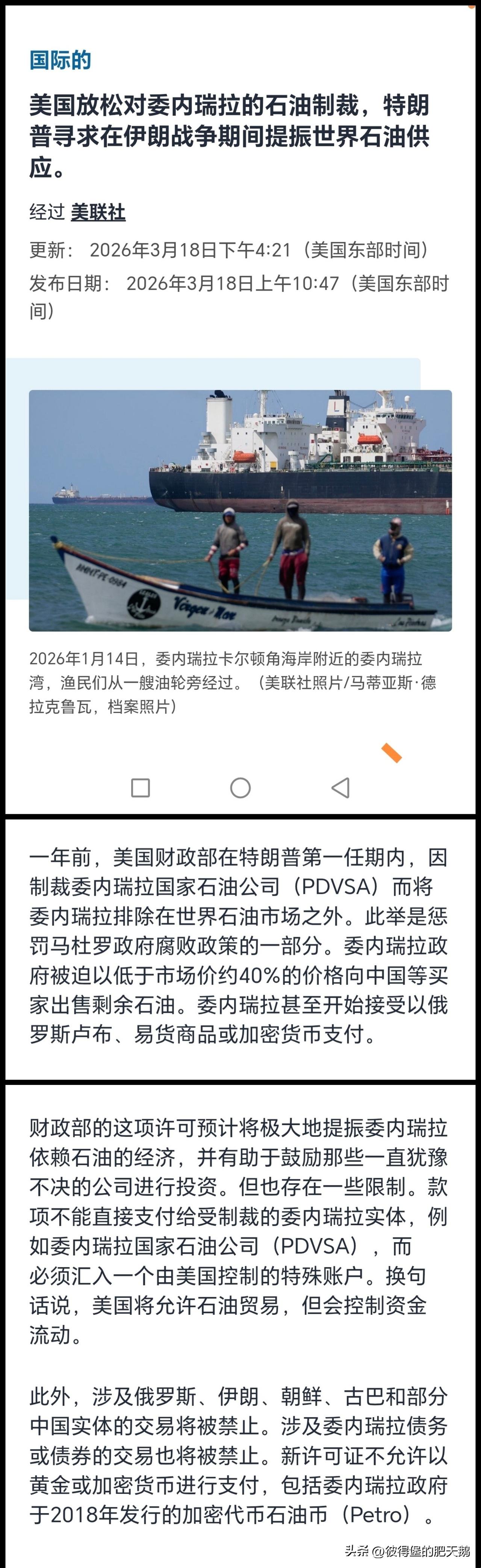 1、委内瑞拉之前为何不能全价出售石油? 3月18日美联社报道:“美国的制裁将委内瑞拉排除在世界石油市场之外。委内瑞拉被迫以低于市场价约40%的价格向中国等买家出售石油。”——美国多年制裁导致委7000亿美元经济损失,给委老百姓带来巨大灾难。 2、美国侵略委内瑞拉后,对于“涉及俄罗斯和部分中国实体的交易将被禁止。涉及委内瑞拉债务或债券的交易也将被禁止。新许可证不允许以黄金或加密货币进行支付”。 ——中国及中国老百姓利益受损,殖人欢欣鼓舞。殖人为何对中国及中国老百姓如此仇恨? 3、卖石油的“款项必须汇入一个由美国控制的特殊账户。换句话说,美国将允许石油贸易,但会控制资金流动。”——会流向哪里? 特朗普称委内瑞拉石油收入只买美货特朗普1月7日在“真实社交”上称,“委内瑞拉已同意将其石油销售所得收入仅用于购买美国制造的商品。” 美国财政部授权美国公司向委内瑞拉石油和天然气行业提供商品、设备和服务,包括必须的相关稀释剂。 4、3月26日,特朗普再谈“赚翻了”。他接受福克斯采访时称:“美军在委内瑞拉的军事行动带来巨大经济利益” “美国从委内瑞拉拿走数亿桶石油。” 5、1月7日,美国副总统万斯在福克斯新闻节目中说:“我们控制着(委内瑞拉的)能源资源,我们告诉委政权,只有服务于美国的国家利益,才可以出售石油,如果不符合美国的国家利益,则不允许出售石油。” 在国际事务上,正常中国人支持的是有利于中国利益的一边,而非单纯支持某国。某些人揣着明白装糊涂,不是傻而是坏! ——美国把中国视为最大对手,拼命打压遏制。美国势大,于中国就不利,中国老百姓利益也会受损。而某些“中国人”为何宁愿自己亲朋同胞祖国利益受损也要支持美国?能分你几美分? 再看看这些年被美西方干预、“解放”的国家,老百姓就过好了吗? (一)人均GDP全球排名(对比颜色革命前的2010年与2024年): 1、伊拉克:制裁前57位 →101位,下降44位; 2、利比亚:55位 → 103位,下降48位; 3、叙利亚:90位→178位,下降88位; 4、也门:135位 → 183位,下降48位; 5、突尼斯:97位 → 119位,下降22位; 6、埃及:115位 → 135,下降20位。 (二)透明国际清廉指数排名(对比颜色革命前的2010年与2025年): 1、伊拉克:萨达姆被抓的2003年第113位 → 136位,下降23位; 2、利比亚:146位 →177位,下降31位; 3、叙利亚:127位 →172位,下降45位; 4、也门:146位 →并列177位,下降31位; 5、突尼斯:59位 →74位,下降15位; 6、埃及:98位 → 130位,下降32位。